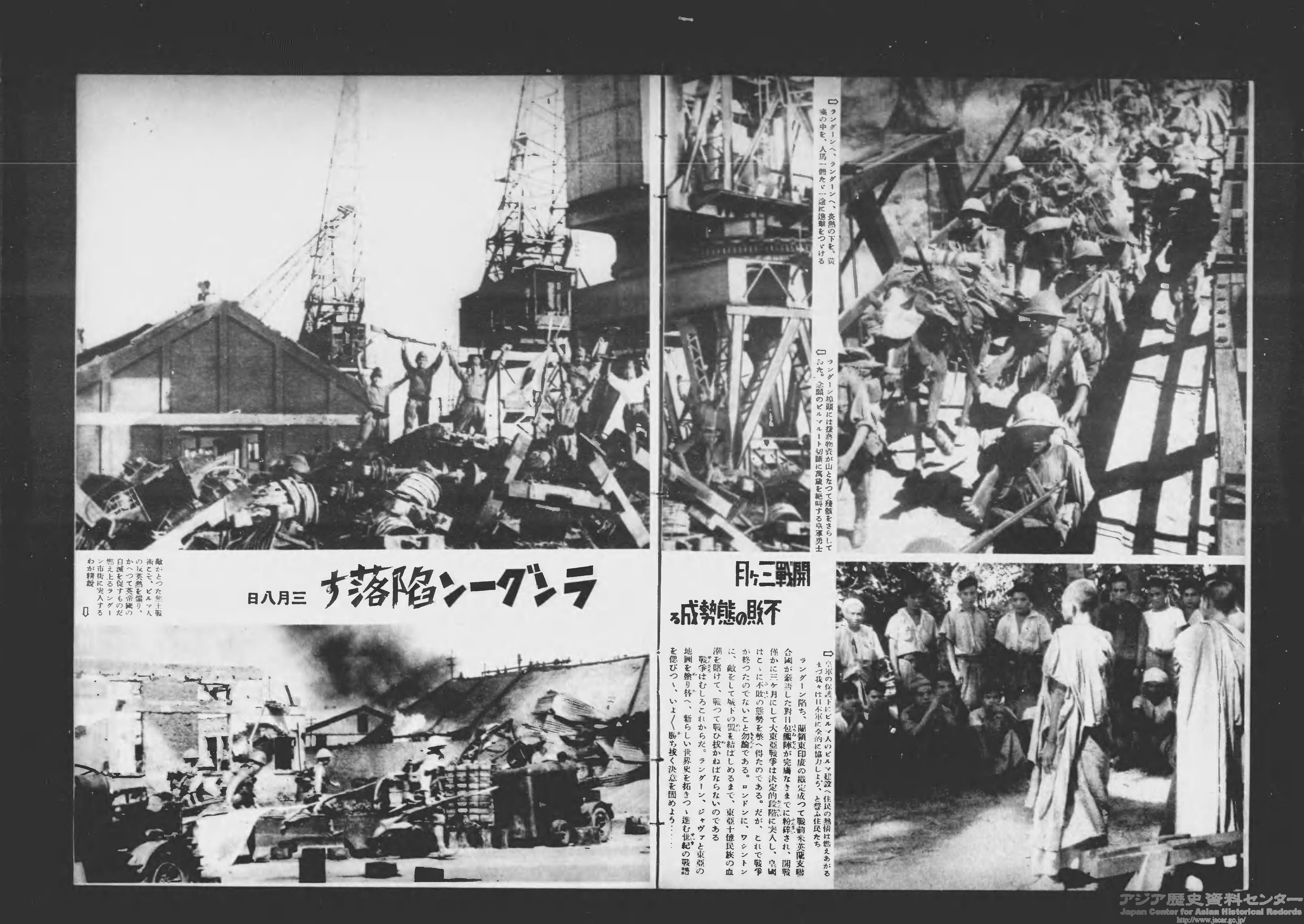 日本軍は、アメリカ領フィリピン、オランダ領インドネシア、イギリス領ボルネオ、イギリス領ビルマ(現・ミャンマー)など東南アジアおよび太平洋各地に侵攻し、戦線を広げていきました。『写真週報』には戦地の写真が次々と報じられます。上記はそれぞれ、1942年2月15日のシンガポール陥落、3月8日のラングーン陥落を報じた記事(3月4日号、4月1日号)。