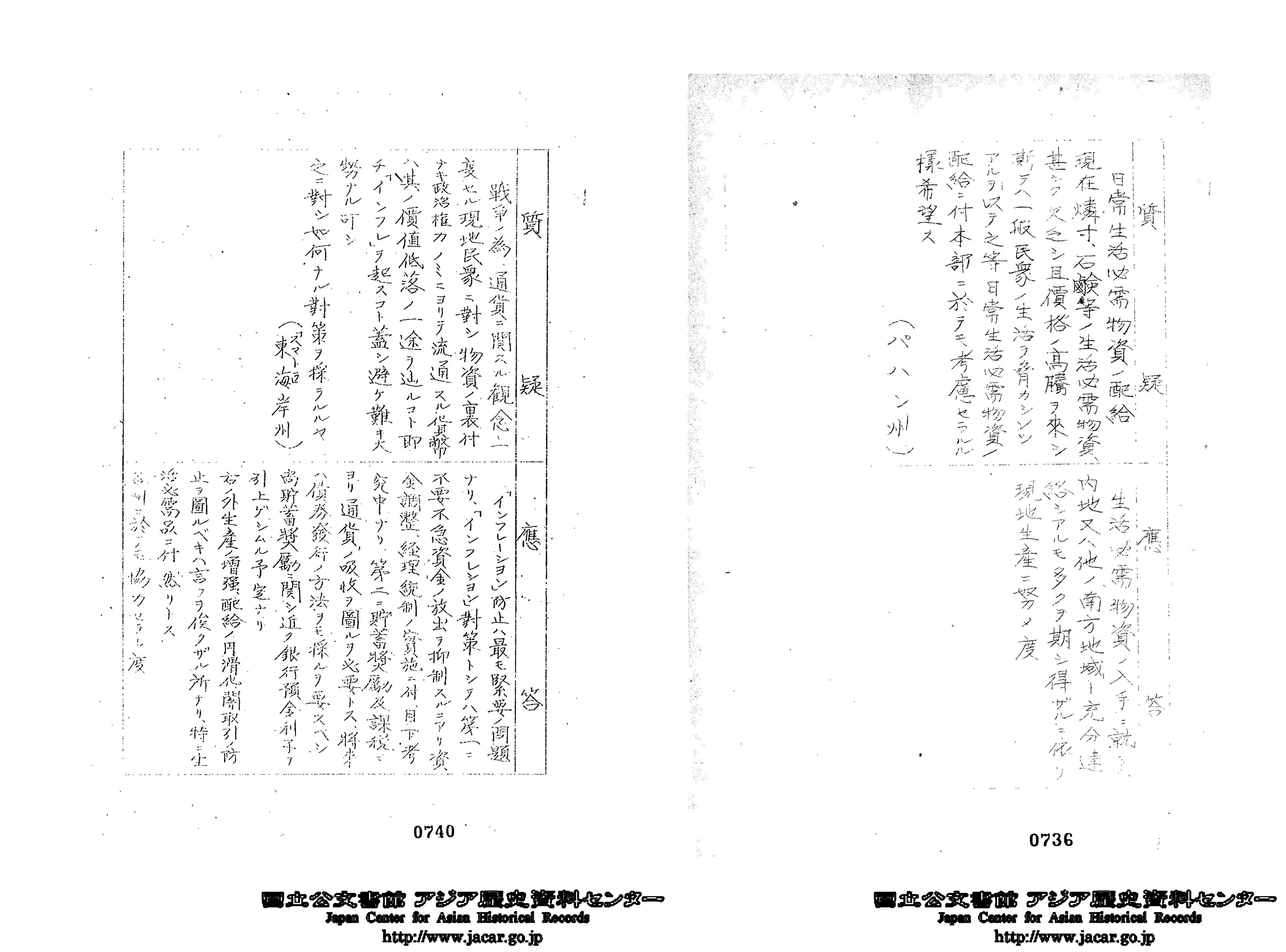 東南アジアの占領地では、「南方占領地行政実施要領」をふまえて軍政が布かれていきます。その行政機構は地域ごとに違いがありますが、マライ(マレー)では各州に日本人の長官・官吏が派遣されました。画像は、各州長官が集まって行われた会議の質疑応答記録(一部)。インフレや生活物資不足への対策要求など、さまざまな応答がなされています。