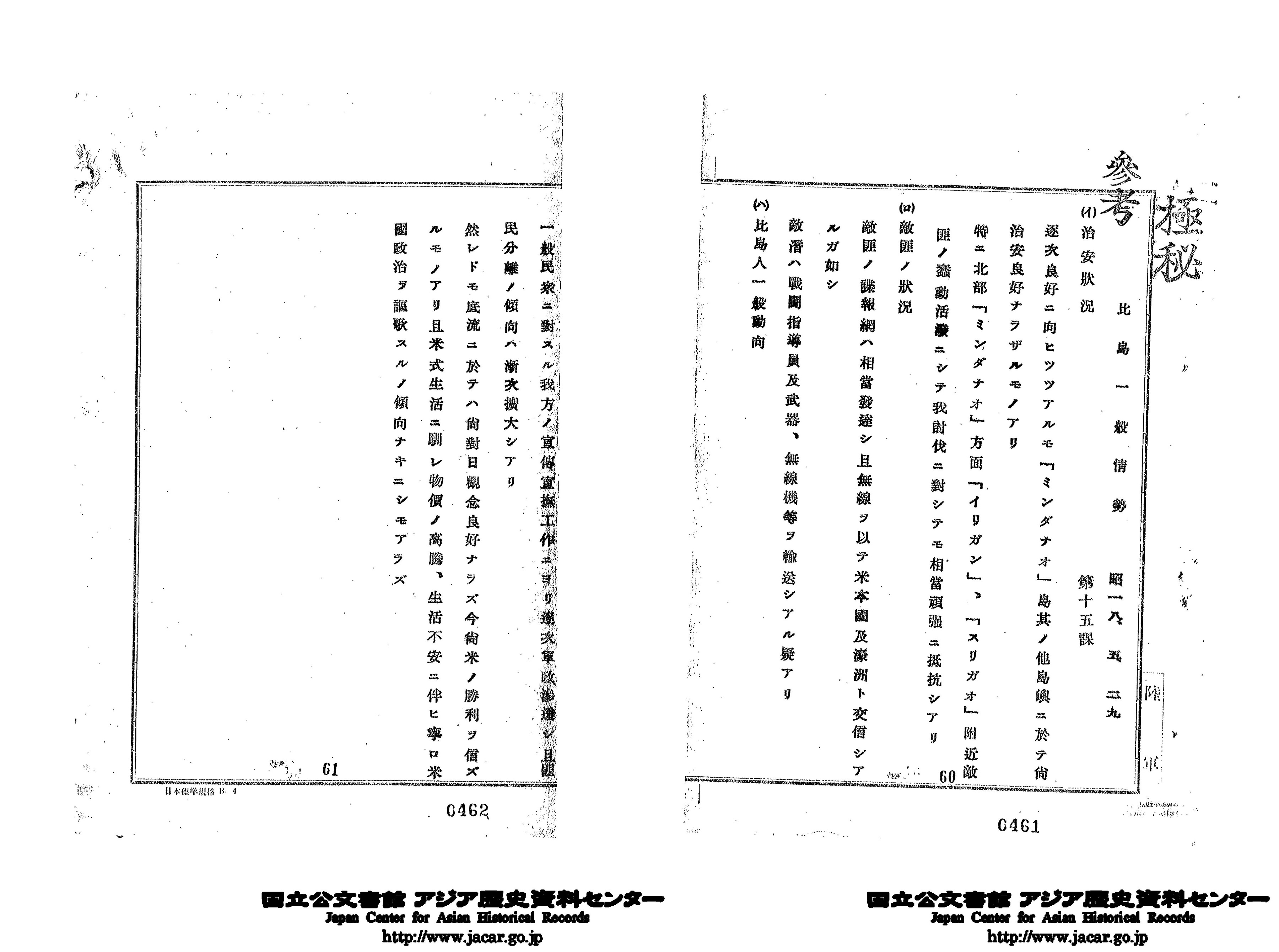 「其3 質疑応答参考資料 総長参考用/16、比島一般情勢」(Ref. C12120195400)1~2画像目
