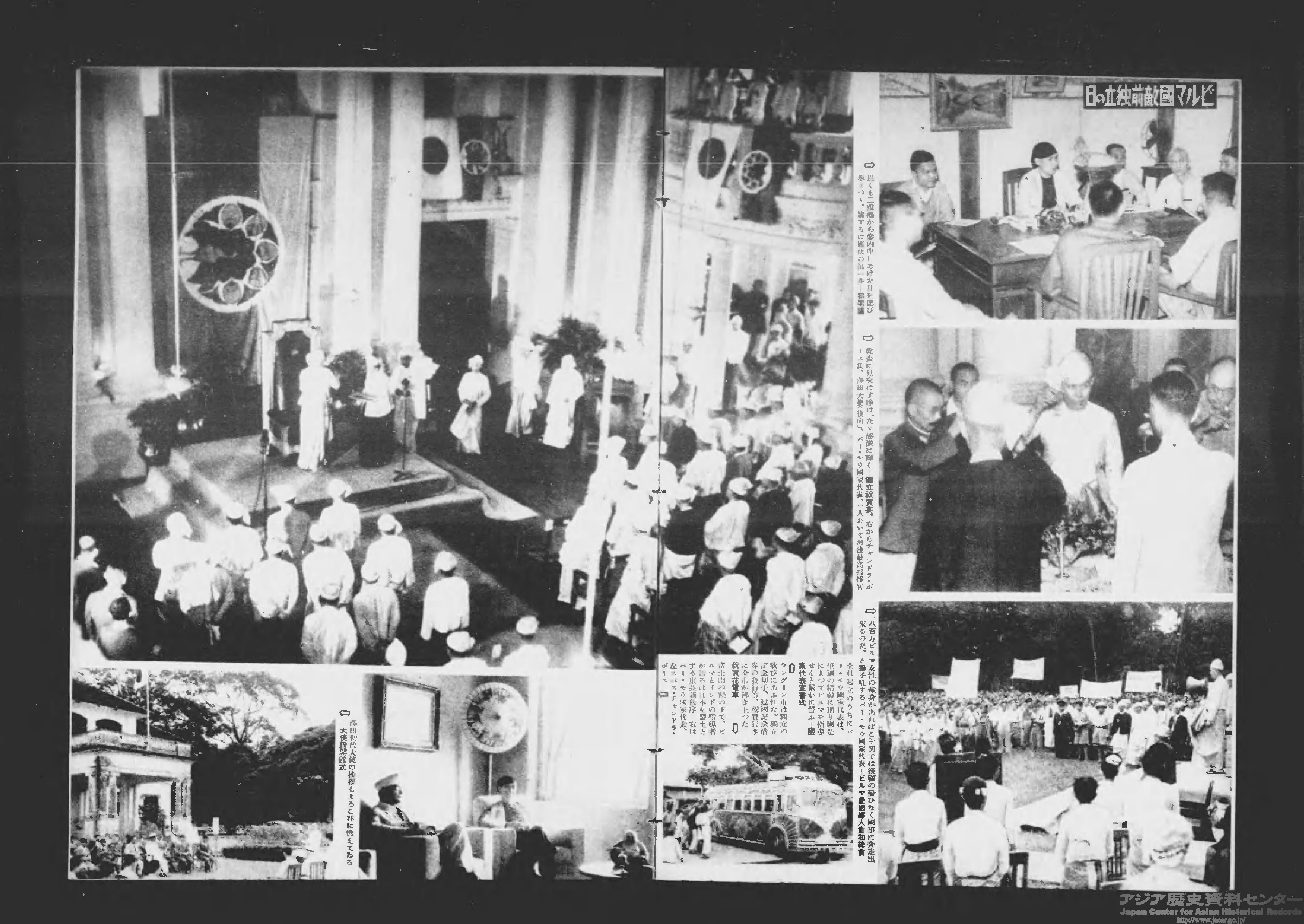 ビルマでは8月1日にバー・モウを元首として独立が宣言されました。『写真週報』は「ビルマ国敵前独立の日」と題してこれを報じました(1943年8月25日号)。