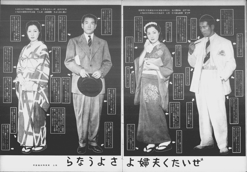 戦時中、生活への統制が強まる中で、華美な服装や髪型は抑制の対象として重視されるようになりました。『写真週報』では、国民がどのような衣服を着用し、髪型にするべきかについて、わかりやすく写真で説明しています。資料1は「ぜいたく夫婦よ、さようなら…」と題し、服装・髪形の良い例・悪い例が示されています。