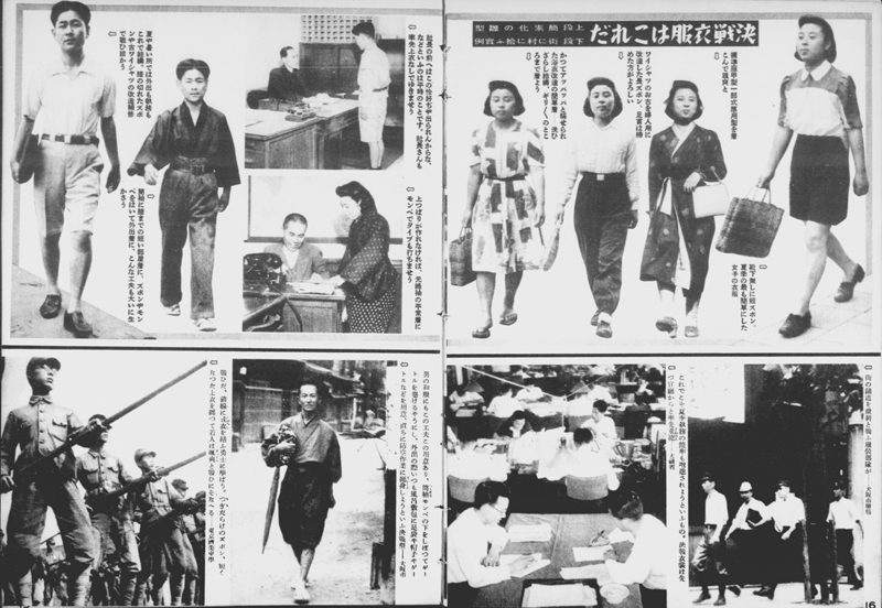 しかし、男性の国民服はある程度普及したのに対し、女性の標準服は根付かなかったようです。清沢洌は昭和19年(1944年)4月28日の日記で、「婦人の服装が、一割は紋平姿、一割六分とかは国民服、一割ぐらいはズボンといった具合になったそうだ。朝のラジオの話。つまり銀座街頭を通る婦人の半分は戦時服装だ。その服装が極めて怪奇複雑なもので、要するに何でもいいといったもの。無統一で醜悪だ。ここらに現代日本の表現があろう。」と述べています。こうした「無統一」さは、資料6の『写真週報』の「決戦衣服はこれだ」における模範的な服装をみると垣間見ることができます。ここで強調されているのは、衣服を「新調をやめて有るものを着れるだけ着ようということ」です。