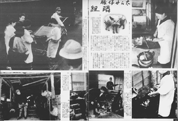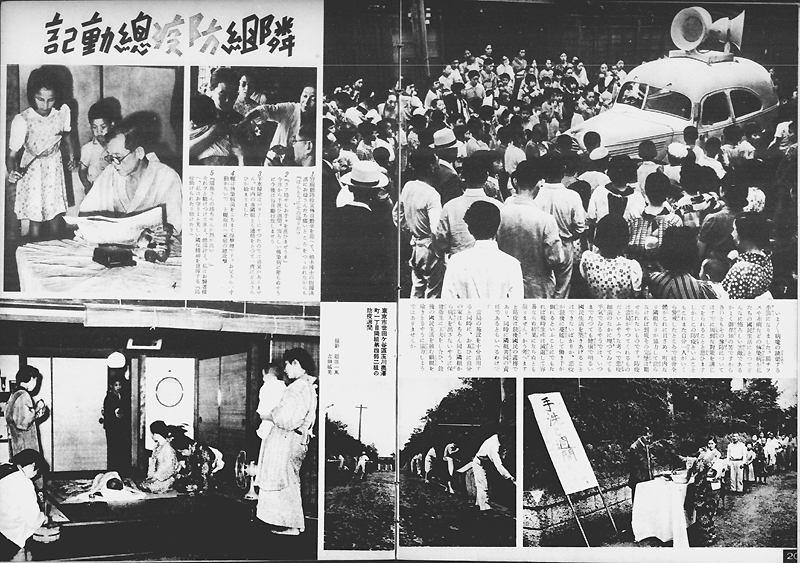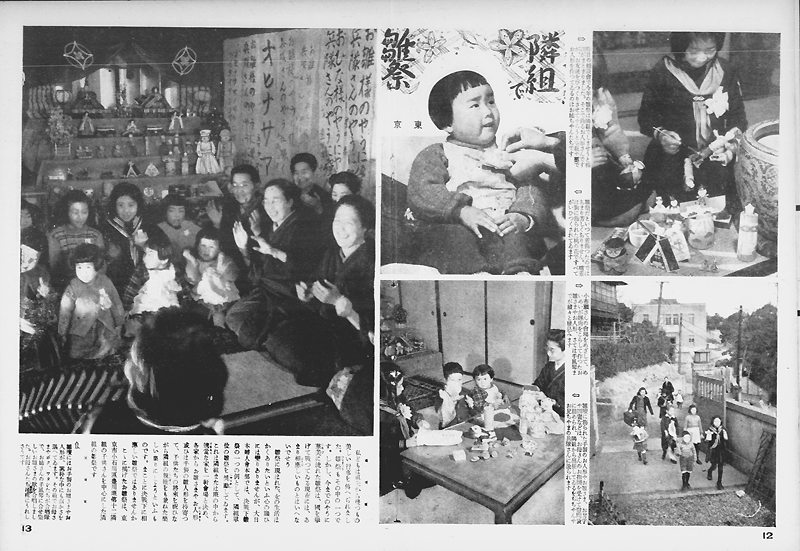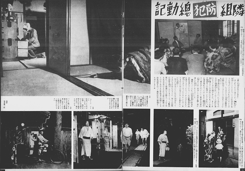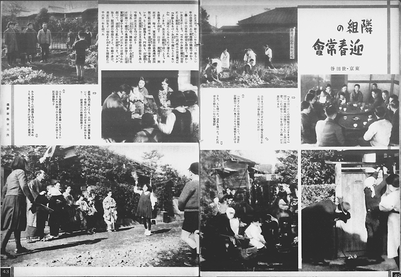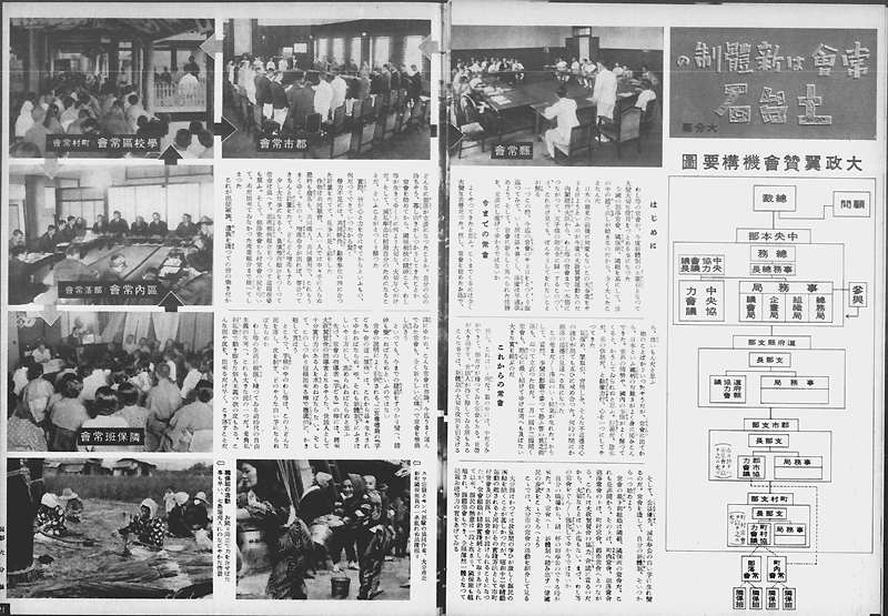 昭和15年(1940年)9月、内務省により「部落会町内会等整備要領」が布告され、町内会・部落会の整備がはかられると共にその下位組織として隣組(隣保班)が組織されました。戦時体制下の国民総動員のための最末端の行政補助組織として位置づけられた隣組は、1組につき5〜10戸程度で構成され、各戸から1名以上が参加する定例集会である常会により運営されました。上に掲げた写真は、昭和15年(1940年)10月16日付の『写真週報』138号に掲載された常会に関する記事です。ここでは大政翼賛会中央本部からその道府県支部、郡市支部、町村支部を経て町内常会・部落常会、そして隣組の常会へと至る組織系統と、大分県におけるその具体例が紹介されています。