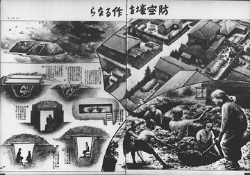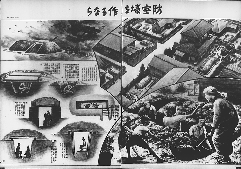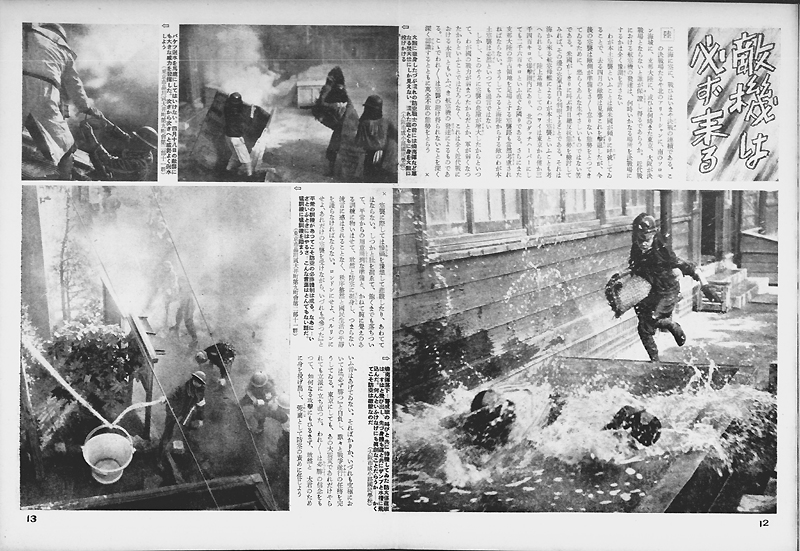 昭和17年(1942年)4月18日、アメリカ軍が初めて日本本土を爆撃すると、日本政府の空襲に対する危機感はいっそう高まりました。上に掲げた写真は、昭和17年(1942年)12月23日付の『写真週報』252号に掲載された記事です。「敵機は必ず来る」と題されたこの記事では、この年4月の空襲をふまえ「今後の空襲は敵がをさをさ怠りない態勢をとつてきてゐるために、恐らくあんな生やさしいものではない筈である」として、空襲への備えを訴えています。