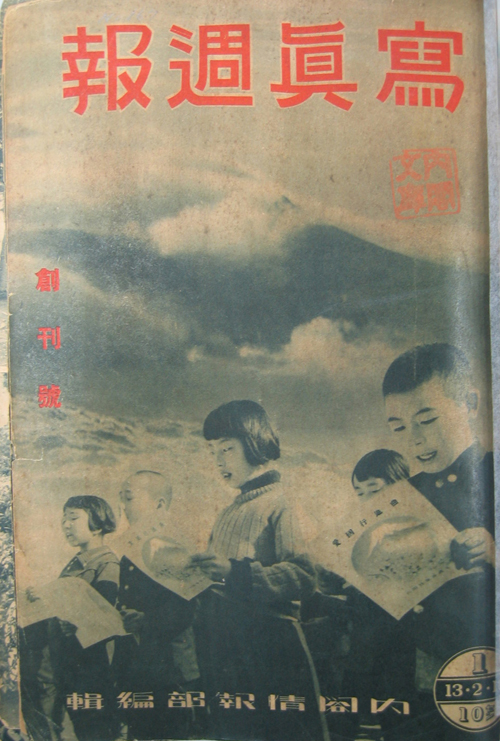 上に掲げた写真は、昭和13年(1938年)2月13日付の『写真週報』創刊号の表紙です。木村伊兵衛の撮影によるこの表紙は、モノクロ撮影された写真に一部彩色がほどこされています。以後の号でも表紙写真は基本的にこのような手法で作成されています。 (なお木村と『写真週報』の関わりについては、トピックス「『写真週報』に登場する著名人 1 『写真週報』に撮影者として登場する著名人」の項目をご参照下さい)。