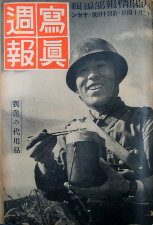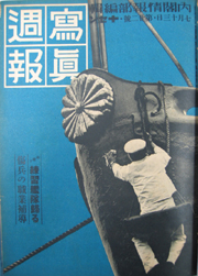 日中戦争が続いていたこの時期には、戦場に題材をとった表紙も掲載されています。左上の写真は、昭和13年(1938年)8月31日付の『写真週報』30号の表紙です。巻末で「秋草茂る中に虫の声あり ふと立ち止りみれば敵の鉄兜一つ、漸く(注−ようやく)おとろへきた日ざしに秋が光る」と説明されているこの写真には、日本軍と交戦していた中国国民党の党章のついたヘルメットがみられます。右上の写真は、昭和13年(1938年)12月14日付の『写真週報』44号の表紙です。この号の巻末には大陸の戦場での兵士とカメラマンのやりとりとして、次のような会話が掲載されています。 「え飯を食つてゐるところの写真ですか、―え、と、こんなでいゝですか、」 「そうです、どうぞそのまゝ」 (キヤメラマンの腕章を見て) 「あゝ、内閣情報部の写真班の方ですな、」 「そうです、写真週報です、」 「…いやあ、どうも、俺みたいな無骨な顔じやまづいだらう、」