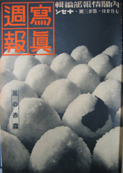 左上の写真は、昭和13年(1938年)7月13日付の『写真週報』22号の表紙です。一見してはどのような状況か分からないこの写真については、この号の巻末に「横須賀軍港に投錨中の帝国軍艦「五十鈴」の艦首を清掃してゐる水兵さん」という解説が付されています。右上の写真は、同年7月20日付の『写真週報』23号の表紙です。こちらも一見不可解な写真ですが、巻末には「日の丸弁当の怒涛、経済戦への弾丸。超広角レンズで視た握り飯」という解説がなされています。