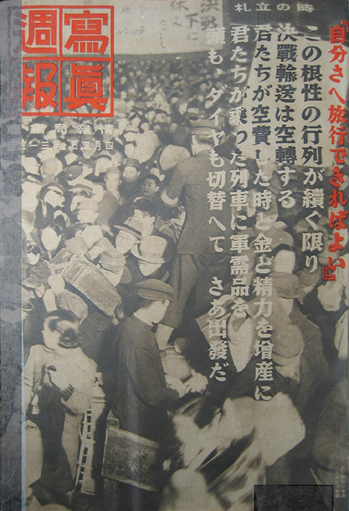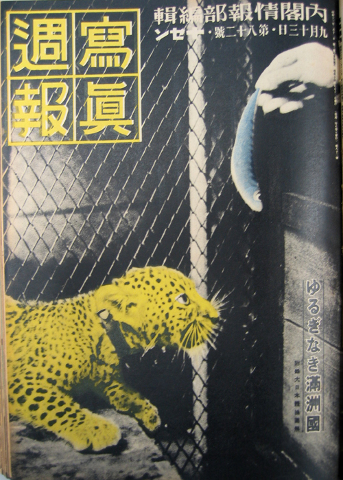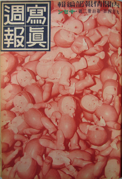 左上の写真は、昭和14年(1939年)9月14日付の『写真週報』82号の表紙です。ヒョウに魚を与えているこの写真については、巻末で以下のような解説がなされています。 「鰯を食ふことにした。 ボクたちを養つてくれる人間さまが、東亜新秩序建設とかいふ大仕事のためにスフ(注−ステープル・ファイバー(人造絹糸)の略)の着物をきたり、一汁一菜で我慢して一生懸命働いてるのに、養はれてゐるボクたちが高価な肉を食ひたゞ便々と寝てゐるだけでは申訳がない。そこで少し前から肉の代りに鰯を食べることにした。最初食べつけるまではぷんとくる臭みや小骨に参つたが、何今ぢやどうして結構いける。不服をいつちや罰があたるわい。」 右上の写真は、昭和15年(1940年)9月4日付の『写真週報』132号の表紙です。これも一見不可解な写真ですが、巻末の解説には以下のように記されています。 「この沢山重なり合つてゐる赤ちゃんは青い目をしたセルロイドのお人形です。 しかしこのお人形は全部日本の生れ、日本の波止場から海を越えて、言葉の分らない南洋諸島、印度、濠州、南北米へと送られてゆきます。―椰子の葉茂る南洋の港に着いた時、お人形たちは目に涙を浮かべて淋しい淋しいと泣いてゐるでせうか?いえいえそれどころか、戦争に必要な物を沢山買いに来たお使ひだと威張つてゐます。」 以上の解説からは、一見戦争とは関わりのないように見える表紙写真も、日中戦争を続けていた当時の日本の状況の一側面を表現していることが分かります。