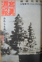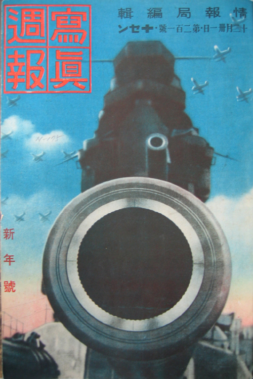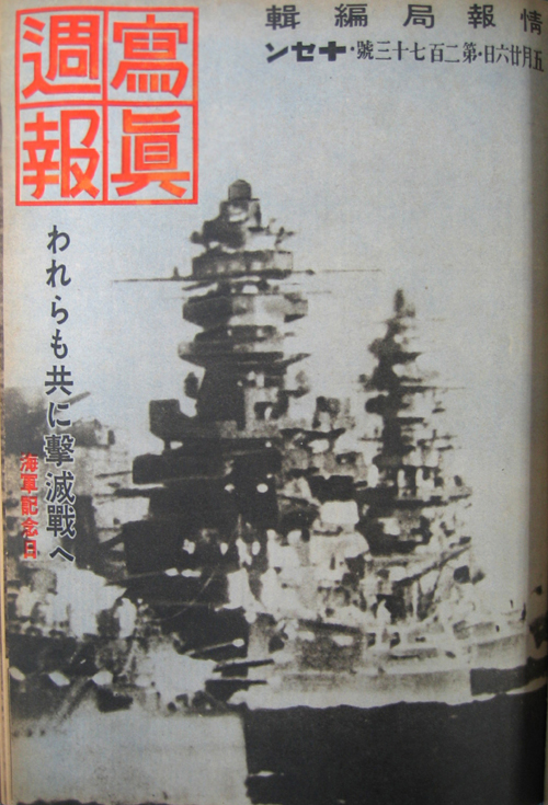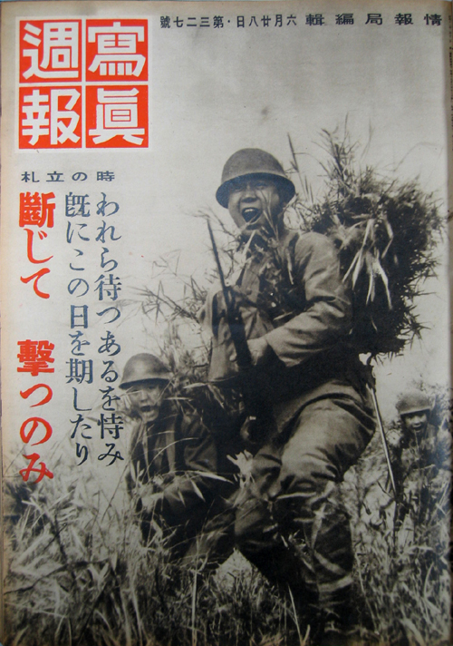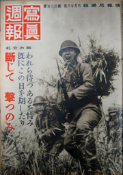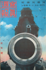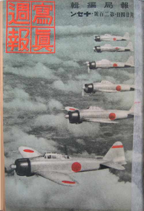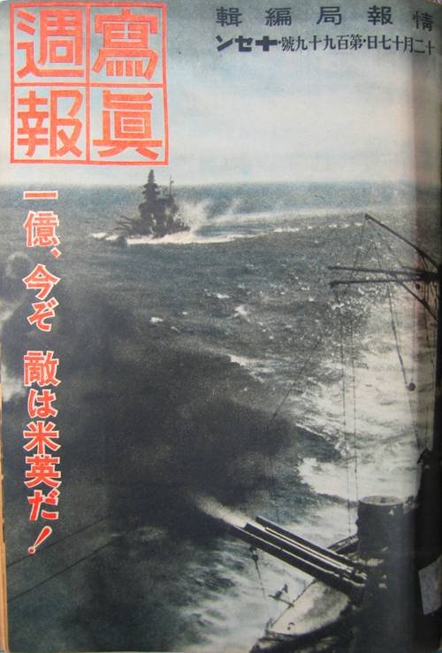 昭和16年(1941年)12月8日、日本軍がマレー半島上陸、ハワイの真珠湾攻撃を開始し、太平洋戦争(「大東亜戦争」)の火蓋が切られると、『写真週報』の表紙にもより直接的にこの開戦の模様に関する写真が掲載されます。左上の写真は、対米英開戦をつたえる最初の号となった昭和16年(1941年)12月17日付の『写真週報』199号の表紙です。ここには「一億、今ぞ 敵は米英だ!」という標語が付されています。 中央の写真は、昭和16年(1941年)12月24日付の『写真週報』200号の表紙です。この号の巻末には表紙について次のような解説が付されています。 「太平洋上における米英の主力艦隊を、開戦僅か三日にして殲滅した我が聯合艦隊航空部隊の威武は燦(注−さん)として中外に宣揚された。 いましもわが新鋭艦上戦闘機は密雲をついて敢然攻撃に向ふ」 右上の写真は、昭和16年(1941年)12月31日付の『写真週報』201号の表紙です。