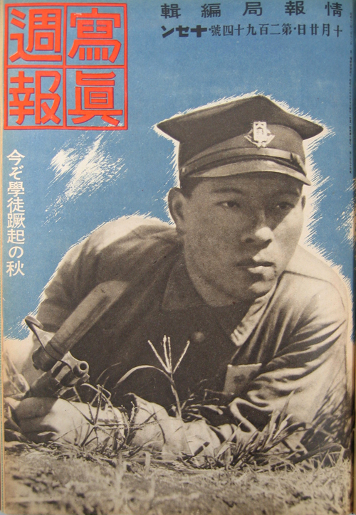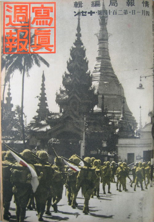 その後、表紙写真には、基本的に戦争に関連する事柄をより直接に表現する写真が多く用いられるようになります。左上の写真は、昭和17年(1942年)4月1日付の『写真週報』214号の表紙です。ここにはビルマのラングーンに進駐する日本軍の写真が用いられています。中央の写真は、昭和18年(1943年)5月26日付の『写真週報』273号の表紙です。巻末には、この表紙について次のような解説が付されています。 「束になつて出てこいと、敵艦隊撃滅に満を持すわが主力艦隊は、太平洋上に厳として存在する。 敵が主力艦十三隻を失つて海上兵力に致命的な打撃をうけてゐるにも拘はらず(注−かかわらず)、わが主力艦隊の健在は、第三十八回の海軍記念日を迎へ、帝国海軍の光彩陸離(注−りくり きらきら輝く様子)たるものがある。」 しかし実際には、前年の昭和17年(1942年)6月5日のミッドウエー海戦で日本海軍は空母4隻等を失い海軍力を大幅に低下させており、またこの『写真週報』273号の発行日のおよそ1ヶ月前にあたる昭和18年(1943年)4月18日には、連合艦隊司令長官山本五十六が前線の視察中に搭乗機をブーゲンビル島上空で撃墜され戦死していました。(この間の経緯については、年表の項目をご参照下さい)。 右上の写真は、昭和18年(1943年)10月20日付の『写真週報』294号の表紙です。同年10月1日付で公布された「在学徴集延期臨時特例」による学生の徴兵猶予措置のほぼ全面的な撤廃をふまえ、軍事教練に参加する学生の写真が用いられています。