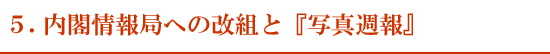 資料5は、昭和15年(1940年)9月28日付の「情報局機構案」です。資料2、資料4と異なり、ここでは『写真週報』の編輯出版が、「検閲」を担当する第四部のうち、「編輯」を担う第二課の管轄とされています。12月に発足した内閣情報局でも、この案と同じく第四部第二課が『写真週報』を管轄しています。