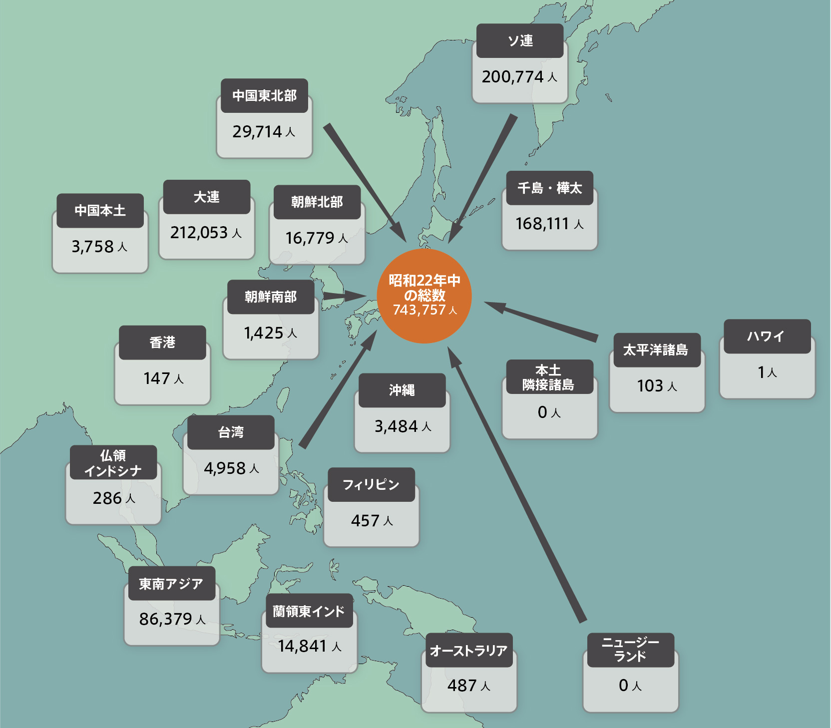 1945年8月15日正午、ラジオから流される昭和天皇の肉声を通じて、日本の敗戦・降伏が国民に伝えられました。ここに日本政府は直ちに2つの難題に直面しました。1つは広大なアジア太平洋地域に展開していた陸海軍の復員・帰還という問題でした。もう1つは海外日本人の引揚という問題でした。当時、「外地」と呼ばれた朝鮮、台湾、満洲、南洋群島等が敗戦によって一挙に失われたからです。また、「日本臣民」として位置づけられていた朝鮮人や台湾人など異民族の処遇という難問も待ち構えていました。