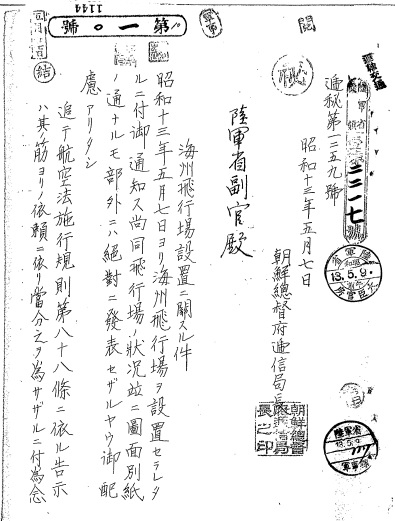 In it, the Bureau sent information about conditions at this then-newly constructed airfield in the western part of the Korean Peninsula along with a diagram of the site to the relevant authorities.