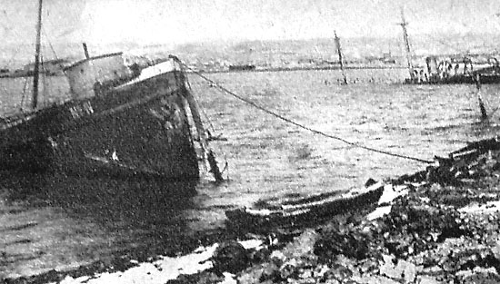Russian battleships attacked by Japanese artillery at the far side of the 203-meter Hill in Lushun (Port Arthur)
