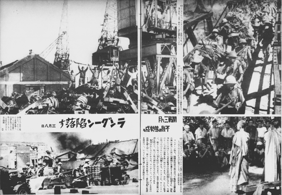 - Document 1 is issue No. 214 of Shashin Shuho, which was published on April 1, 1942. On the cover of this issue is a photograph of Japanese forces entering Rangoon, and on the inside of the cover is a photograph of Japanese soldiers who are described as taking in a “reclining Buddhist statue” at Pegu in northwestern Rangoon. There is also a spread of photographs depicting different scenes in Rangoon (see the first to third images).