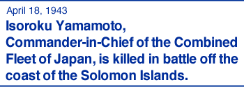 On April 18, 1943, Isoroku Yamamoto, Commander-in-Chief of the Combined Fleet of Japan, was killed during an inspection tour of the battlefront when the plane in which he was flying was shot down off the coast of the Solomon Islands |