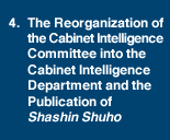 The Cabinet Information Committee, which was officially established in 1936, was reorganized into the Cabinet Intelligence Department on September 24, 1937. In addition to “liaising and coordinating” the information operations the Cabinet Information Committee had undertaken, through this reorganization the Cabinet Intelligence Department was also entrusted with the added responsibilities of “gathering information not belonging to other government organizations, reporting, and conducting awareness-raising campaigns and publicity activities.”