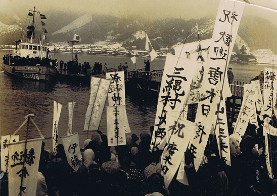 平の桟橋で引揚者を出迎える人々 昭和31年12月26日撮影(舞鶴引揚記念館所蔵)