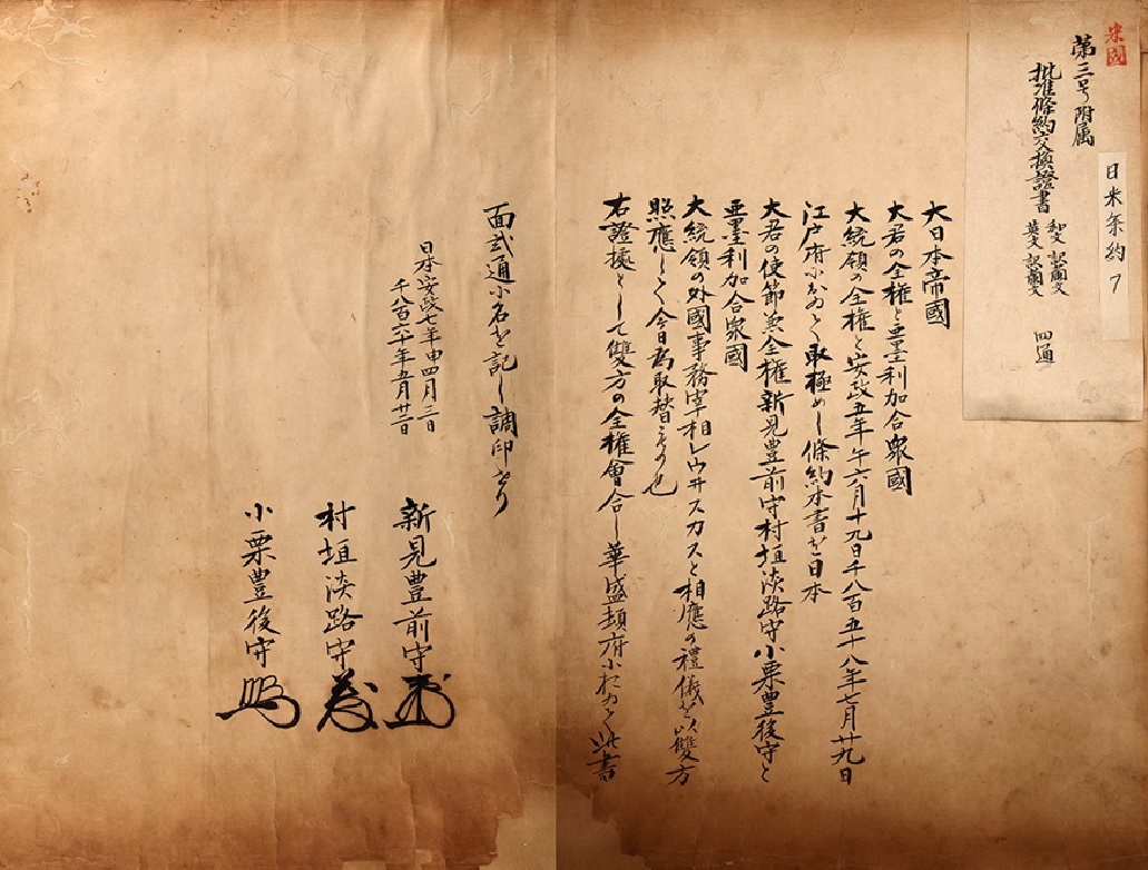 安政5(1858)年、日本はアメリカと日米修好通商条約を調印し、箱館・神奈川(のち横浜に変更)・新潟・兵庫・長崎の開港、江戸・大坂の開市(通商許可)などを承認し、下田は調印直後に閉鎖します。続いてオランダ・ロシア・イギリス・フランスとも同様の条約を締結し、所謂、安政の五ケ国条約を結びました。これらの条約は法権・関税自主権などで締結国と対等でない不平等条約でした。このため、後に明治政府において不平等条約改正が日本の重要課題となりました。さらに、開港に反対する人々の間で攘夷論が盛んとなり、尊王論と結びついて尊王攘夷運動へと展開します。