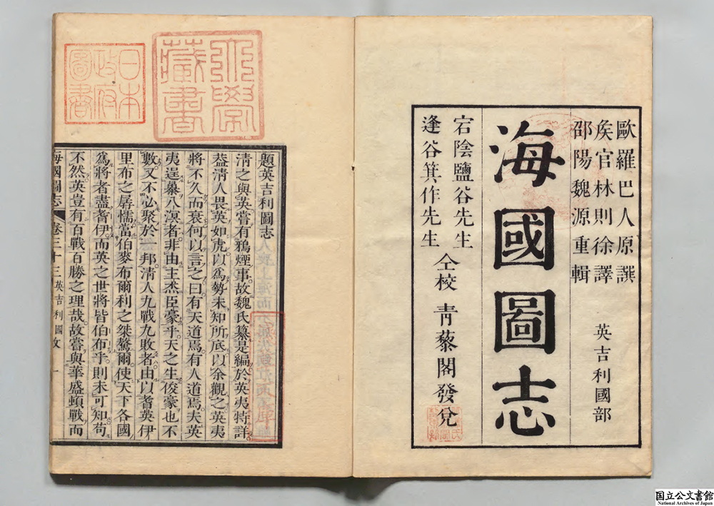 まず幕末の日本において西洋文明紹介として広く読まれたのは、中国・清の官僚、魏源による『海国図志』でした。アヘン戦争後に編纂された『海国図志』は、世界各国の地理に加え、各国の歴史や国情、造船や鋳砲といった軍事技術に関する記述を盛り込んだ、中国における初の本格的な近代西洋文明の解説書でした。『海国図志』は禁書として幕府に秘蔵されていましたが、当時勘定奉行だった川路聖謨の目に止まったことで校訂を施された上で出版され、さらに漢学者と蘭学者の協力により『海国図志』のわかりやすい和刻本が出版されたことにより、『海国図志』は日本の幅広い読者層に広まっていきました。