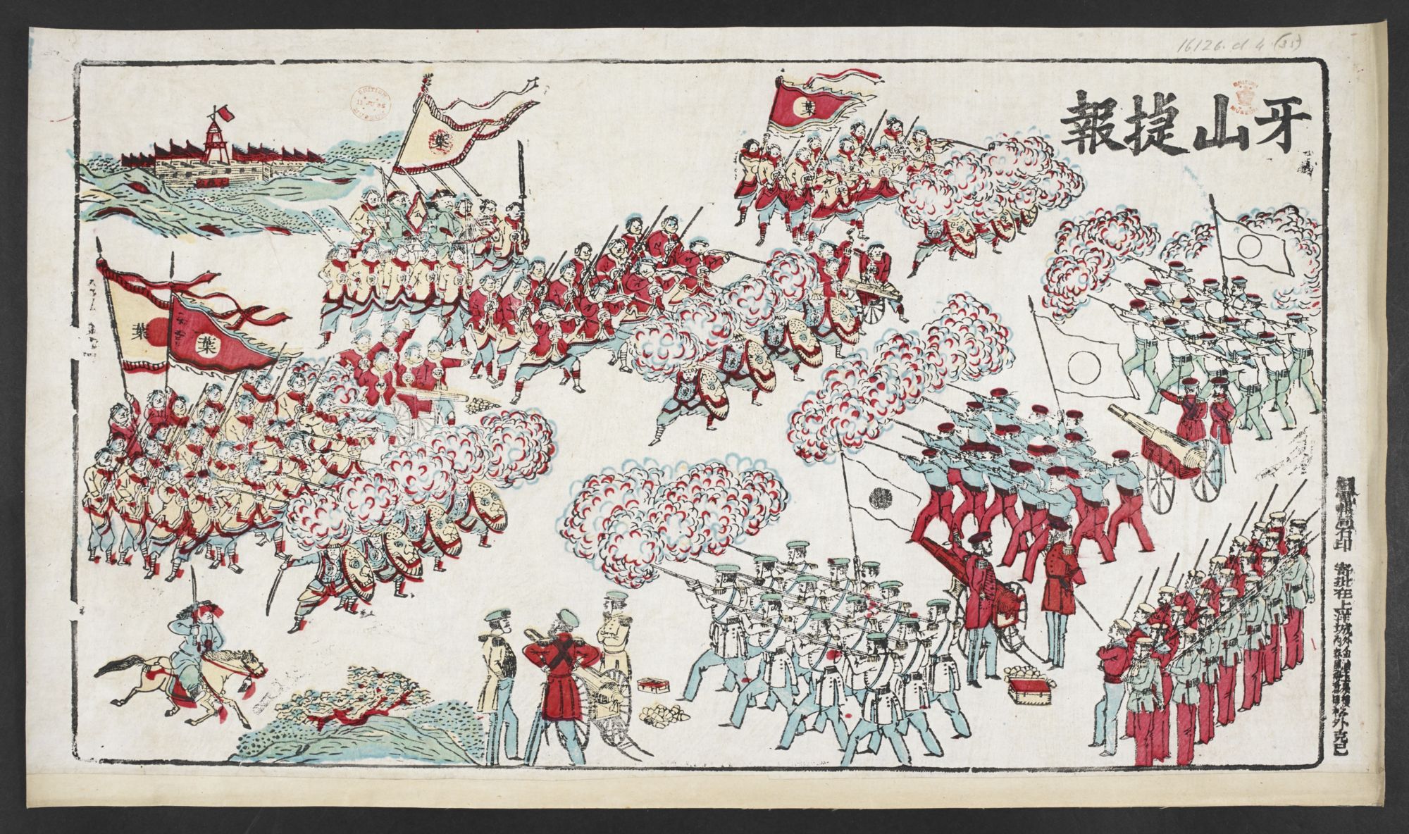 - 明治27年(1894年)7月29日、牙山の清国軍の拠点の攻撃に向かう日本軍と成歓駅付近に陣営を構えていた清国軍との間で、日清戦争最初の陸戦となる戦闘が起きました。成歓を陥落させた日本軍はすぐに牙山に進みましたが、清国軍は牙山の不利な地形を避けて移動した後でした。ここでは、牙山での戦闘の様子が描かれています。