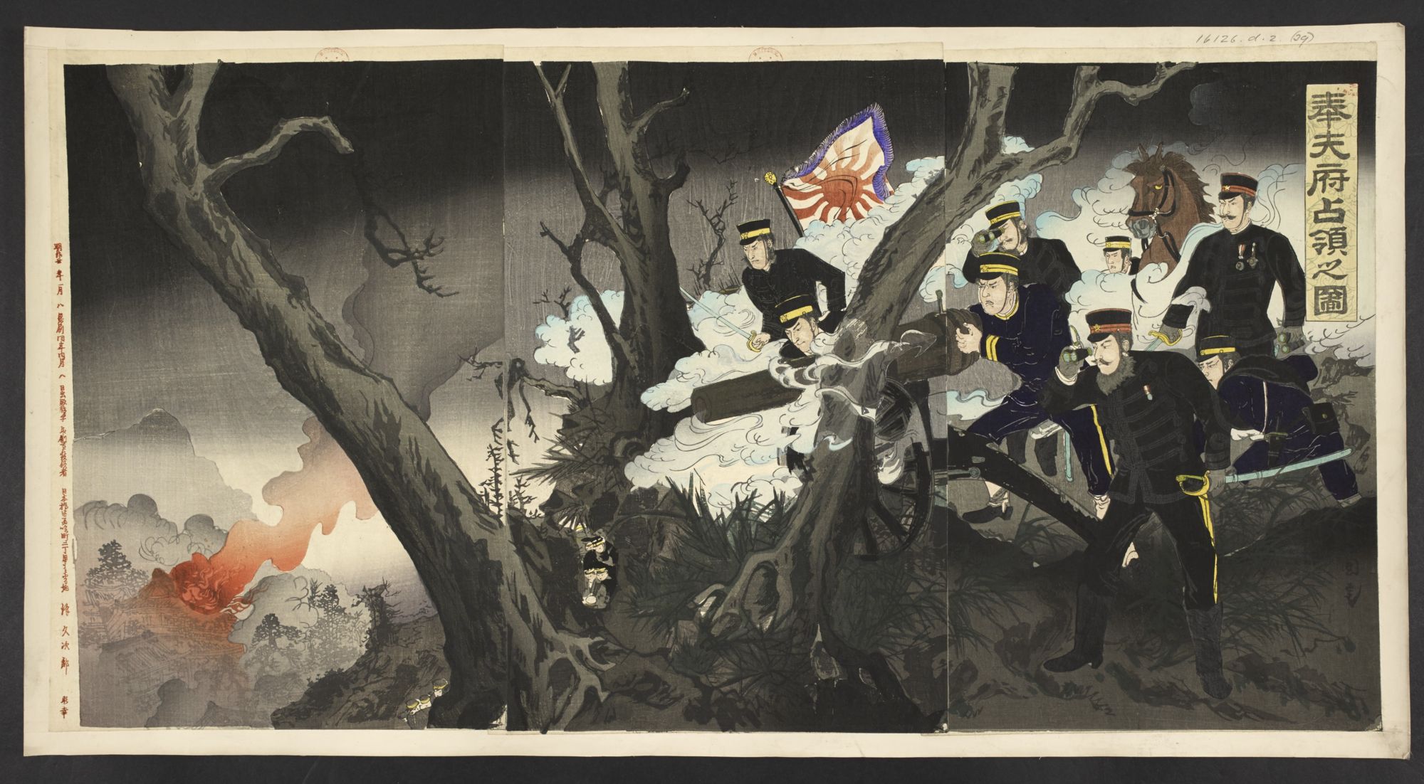 - 明治27年(1894年)12月13日、奉天方面に向かっていた日本軍は奉天府内の海城を攻撃しこれを占領しました。しかしその後、交通の要衝でもあるこの海城を奪還しようと清国軍もたびたび反撃を繰り返し、両軍の間では冬の厳しい寒さの中での戦闘が続きました。ここでは、奉天府で砲撃を行っている日本軍兵士たちの姿が描かれています。