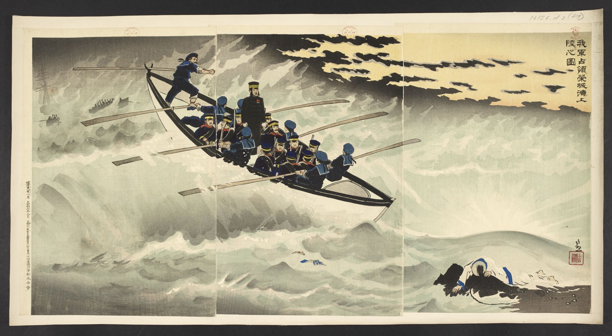 - 明治28年(1895年)1月20日、前年の11月に旅順を占領していた日本軍は、清国艦隊(北洋艦隊)の拠点である威海衛の攻撃を行うために海路山東半島に進み、栄城湾からの上陸を行いました。ここでは、軍艦からボートに乗り換えて上陸を行う日本軍の兵士たちの様子が描かれています。
