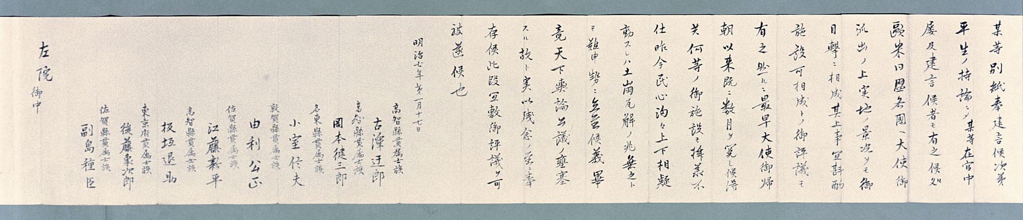 明治期の建白書と言えば、明治7年(1874年)の板垣退助らによる民撰議院設立建白が有名です(1)。国会開設を求めるこの建白書の提出から、自由民権運動が始まりました。明治12年(1879年)には、千葉県の桜井静による提案を契機として、全国各地から国会開設の建白書が提出されています。