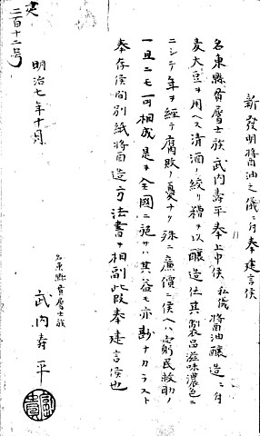 - (3)は、名東県(現在の徳島県、香川県、兵庫県の一部)の士族・武内寿平が、明治7(1874)年に提出した「新発明醤油之儀ニ付建言」という建白書です。その新発明の醤油とは、麦大豆を使用せず、清酒の絞り粕で醸造したもので、「滋味濃色ニシテ、年ヲ経テ腐敗ノ憂ナク、殊ニ廉価」であり、実用化すれば「窮民救助ノ一旦〔ママ〕ニモ」なるとしています。建白書には、具体的な醸造方法を記した「新発明醤油製造方法書」が附されています。