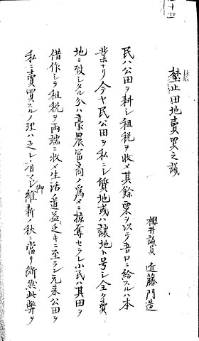 - (4)は、桜井(現千葉県木更津市の桜井藩か桜井県か)の近藤門造が提出した「禁止田地売買之議」(年代不詳)です。江戸幕府が田畑の売買を禁じた田畑永代売買禁止令(寛永20年・1643年)は、江戸中期以降に形骸化していきました。近藤は、その現状と将来を「民、公田ヲ私ニシ、質地或ハ譲地ト号シ、全ク売地ニ致シタル分ハ、豪農富商ノ為メニ掠奪セラレ、小民ハ、其田ヲ借作シテ租税ヲ両端ニ収メ、生活ノ道、益々乏キニ至ラン」として、田畑の売買を禁止すべきと主張しています。これに対して、明治政府は1872年、田畑永代売買禁止令を廃止して、土地売買の現実を追認しました。