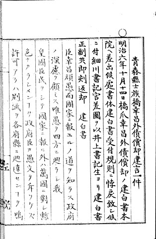 - 明治6(1873)年に青森県の士族・橋爪幸昌が提出した、外債(外国からの借金)問題に関する建白書は、新聞に掲載されて大きな社会的反響をよびました。(6)は、橋爪の建白に関する新聞記事の写しが所収されている史料です。橋爪の主張は、当時話題となっていた巨額の外債について、国民一人当たりにすればわずか16銭2厘にすぎないとして、政府への献金を呼びかけるものでした。建白書は、この献金運動への許可を政府に求めたものです。しかし、明治政府は、外債の償却は政府の義務であり、その目途も立っているとして、橋爪の提案を拒んでいます。