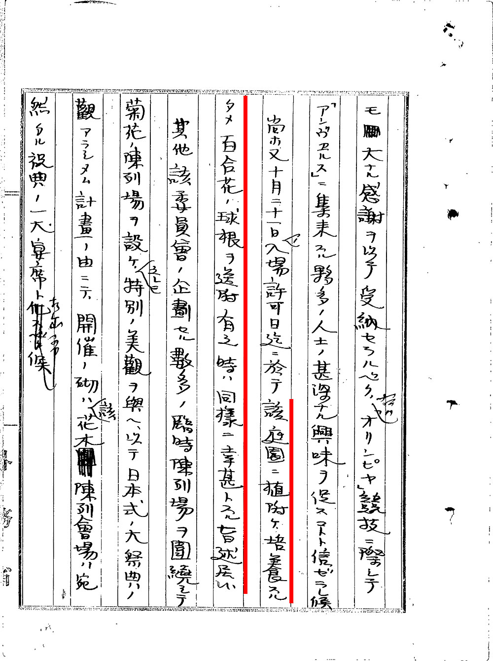 その後もさまざまな展覧会の場で日本のユリが展示されました。たとえば、大正9年(1920年)にベルギーのアントワープで開かれた国際花木展覧会では、展覧会委員長から会場内の日本庭園に植えるためにユリの球根を送って欲しいとの手紙が送られています (3)。ただ、この時は既にユリの休眠期を過ぎて遠路の輸送に耐えられないという理由で出品を見合わせ、代わりに横浜植木株式会社のロンドン支店から盆栽を出品する旨が回答されています (4)。日本の盆栽も、当時欧米で愛好されていた日本産物品のひとつでした。