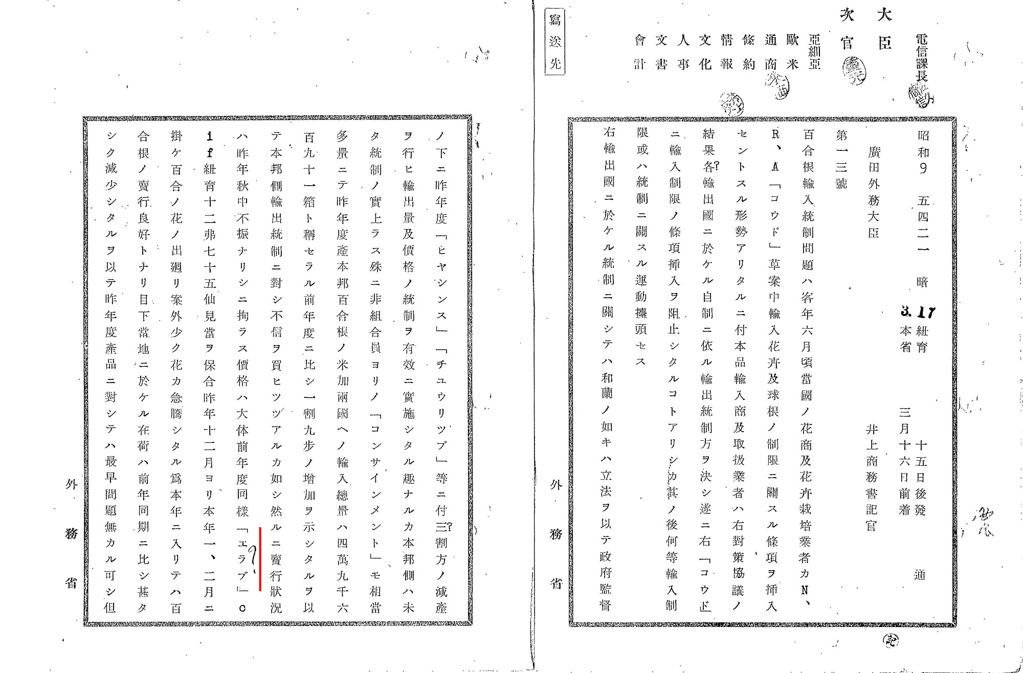 輸出が始まった当初、ユリ根の産地は輸出港横浜に近い関東近郊に限られていましたが、明治時代半ば以降、鹿児島県の南島地域も主要な産地のひとつとなります。特に鹿児島県沖永良部島産のユリは「永良部百合」の名で海外でも親しまれました。 (9) は、昭和9年(1934年)に日本とアメリカの間で起こったユリ根輸入統制問題に関する資料ですが、その中に「エラブ」百合という言葉が出てきます。