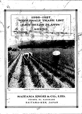 一口にユリといっても、いろんな種類があります。ユリ根の輸出に携わる日本の園芸会社は、欧米の業者が種類を間違えないで買えるように、英語で書かれた目録を作っていました。アジ歴の資料の中には、ユリ根取引をめぐる案件の参考資料として、埼玉県の園芸会社が発行した英文の卸し売り商品目録が収録されています。以下、その内容を見ていきましょう。 まず、表紙にはユリ根栽培用の畑とそこで働く人の写真が載っています(13)。広大な畑に、列状にユリが植えられています。園芸農家は、輸出する球根の大きさに合わせて、この畑で1~4年の期間ユリ根を育ててから、出荷していました。
