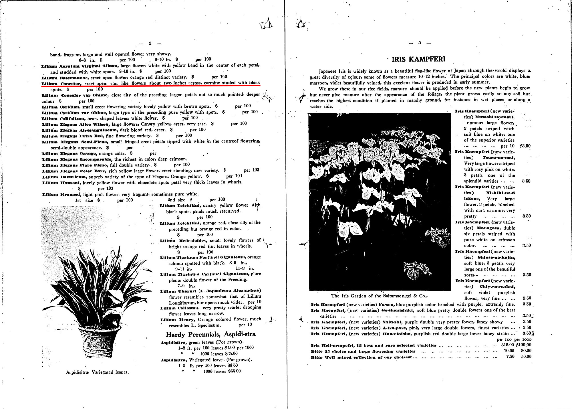 中を開けると、まずユリ(Lilies)の項目があり、その冒頭には「イースターやクリスマス用の花として、広く愛されているユリほど美しい花はありません」と書かれています。欧米諸国でこれらの行事の時に飾りつける花の一つとして、日本のユリが使われていたことがわかります。 続いて具体的な品種名が挙げられます。輸出量の多い品種としては、Lilium formosum(タカサゴユリ)、Lilium Auratum(ヤマユリ)、Lilium Magnificum(シロカノコユリの変種)など6種類が挙げられ、それぞれについてサイズと1ケースあたりの価格が書かれています(14)。ただ価格については変動が大きいことと、購入側からの価格提示によって最低価格を見積もることが脇に注記されています。 さらに、その他の全36種類については花の特徴が記されています。たとえばLilium Concolor(ヒメユリ)については「上を向いて咲く星形の花で、直径はおよそ2インチ。洋紅色で黒い斑点がある」と書かれています(15)。