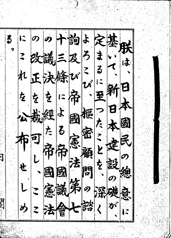 なお宣戦布告の具体例としては、(13) のような、明治37年(1904年)の日露戦争の際に日本がロシアとの戦いを始める事を宣言した天皇の詔勅があります。詔勅とは天皇が自らの意志を表示する際の文書を指します。