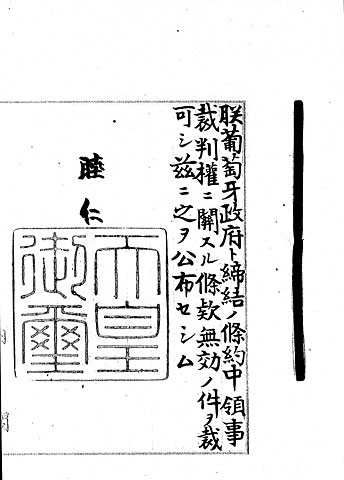 (8) は、明治25年(1892年)7月14日にポルトガルの領事裁判権の廃止が決定された際の明治天皇による御署名原本です。萬延元年(1860年)に江戸幕府が葡萄牙政府(ポルトガル政府)と締結した条約の中の「領事裁判権に関する条款無効の件を裁可し茲(ここ)に之(これ)を公布せしむ」と定めています(原文カナ旧字)。これによって、以降は日本にいるポルトガル人は日本の法律によって裁かれることになりました。