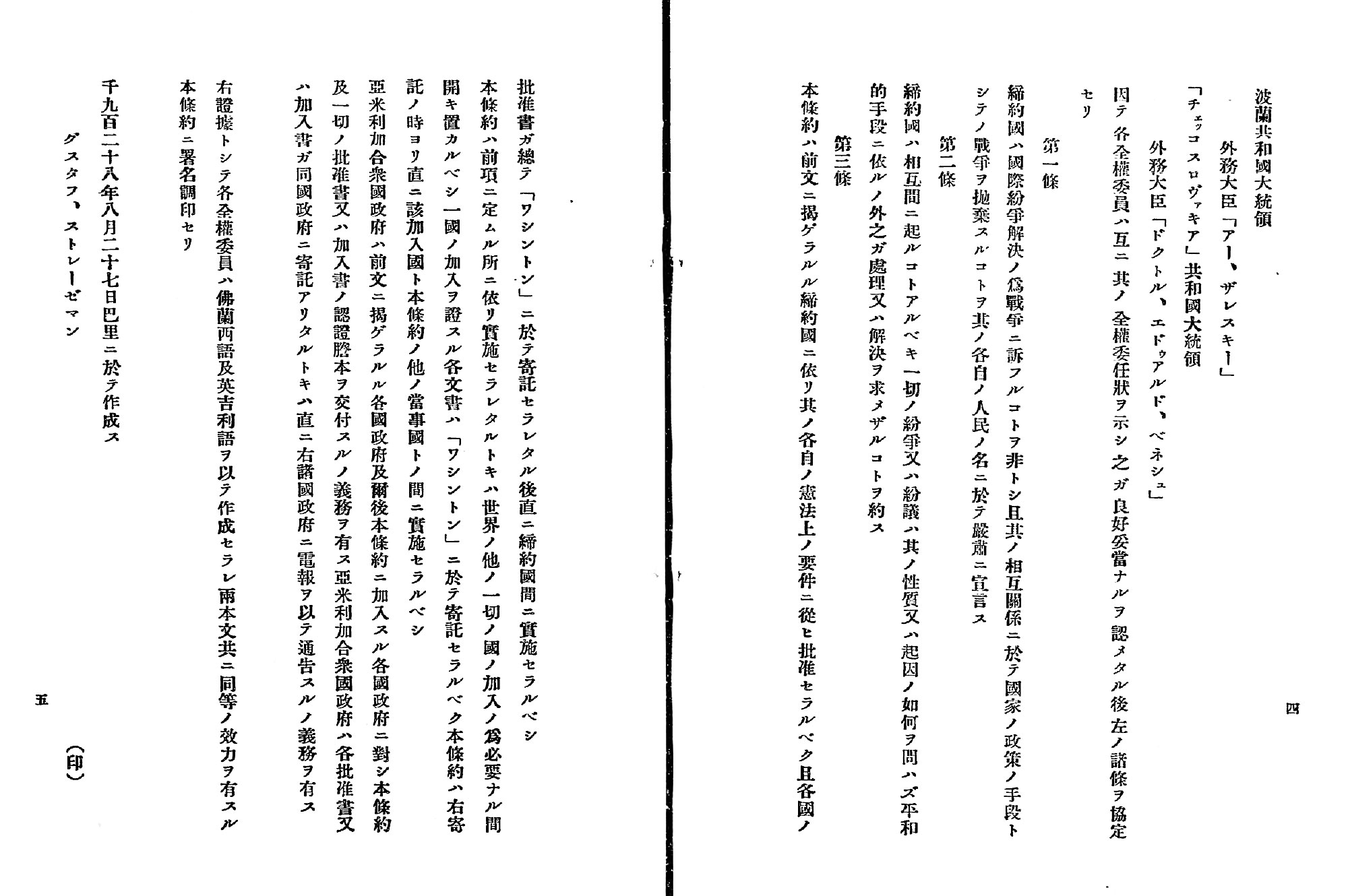 (14) は、昭和3年(1928年)にフランスのパリで調印された「戦争抛棄ニ関スル条約」こと通称「不戦条約」の和訳文です。この条約は、条約に加盟する国々が「国家の政策の手段としての戦争を放棄する」(第一条)事、「一切の紛争又は紛議は其の性質又は起因の如何を問はず平和的手段に依る」(第二条)事を宣言しています(いずれも原文カナ旧字)。この不戦条約は、第一次世界大戦(1914年~1919年)の後に世界平和の機運が高まる中で締結されたもので、条約を結んだ国は、日本以外にはドイツ、アメリカ、ベルギー、フランス、イギリス、イタリア、ポーランドなどでした。にもかかわらず、この条約が調印された9年後に日中戦争が、そして11年後には第二次世界大戦が始まります。