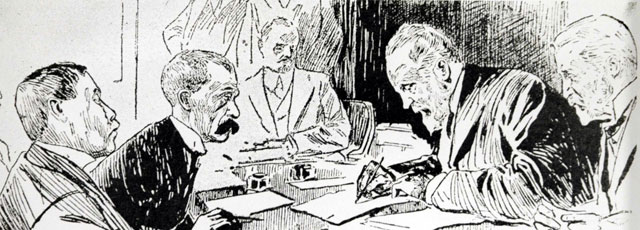 ポーツマス講和会議では、なかなか話がまとまらない状況が続きました。このため、後半にはいろいろなかたちで話し合いが行われるようになっていました。つまり、正式な講和会議(本会議)とは別の場での会議があったのです。これはまさに「舞台裏」での出来事と言えるでしょう。アジ歴には、こうした場で何が話し合われたのかを確認することのできる記録があります。「日露講和談判筆記 附両国全権委員非正式会見要録」という文書には、本会議での参加者たちの発言の内容と、「秘密会議」や「非正式会見」の様子が記録されています。日本側全権代表の小村寿太郎( (1) :手前の列の左から3番目、および (4) )や、ロシア側全権代表のセルゲイ・ウィッテ( (1) :奥の列の左から3番目)の講和会議での実際の発言内容を確認できることも貴重ですが、ここでは、「舞台裏」に注目してみましょう(レファレンスコード:B06150094000 日露講和談判筆記 附両国全権委員非正式会見要録)。