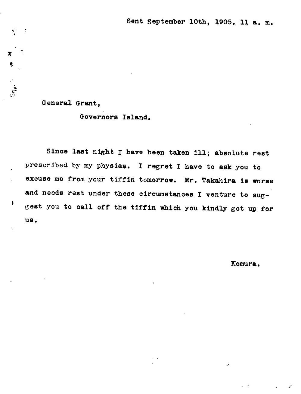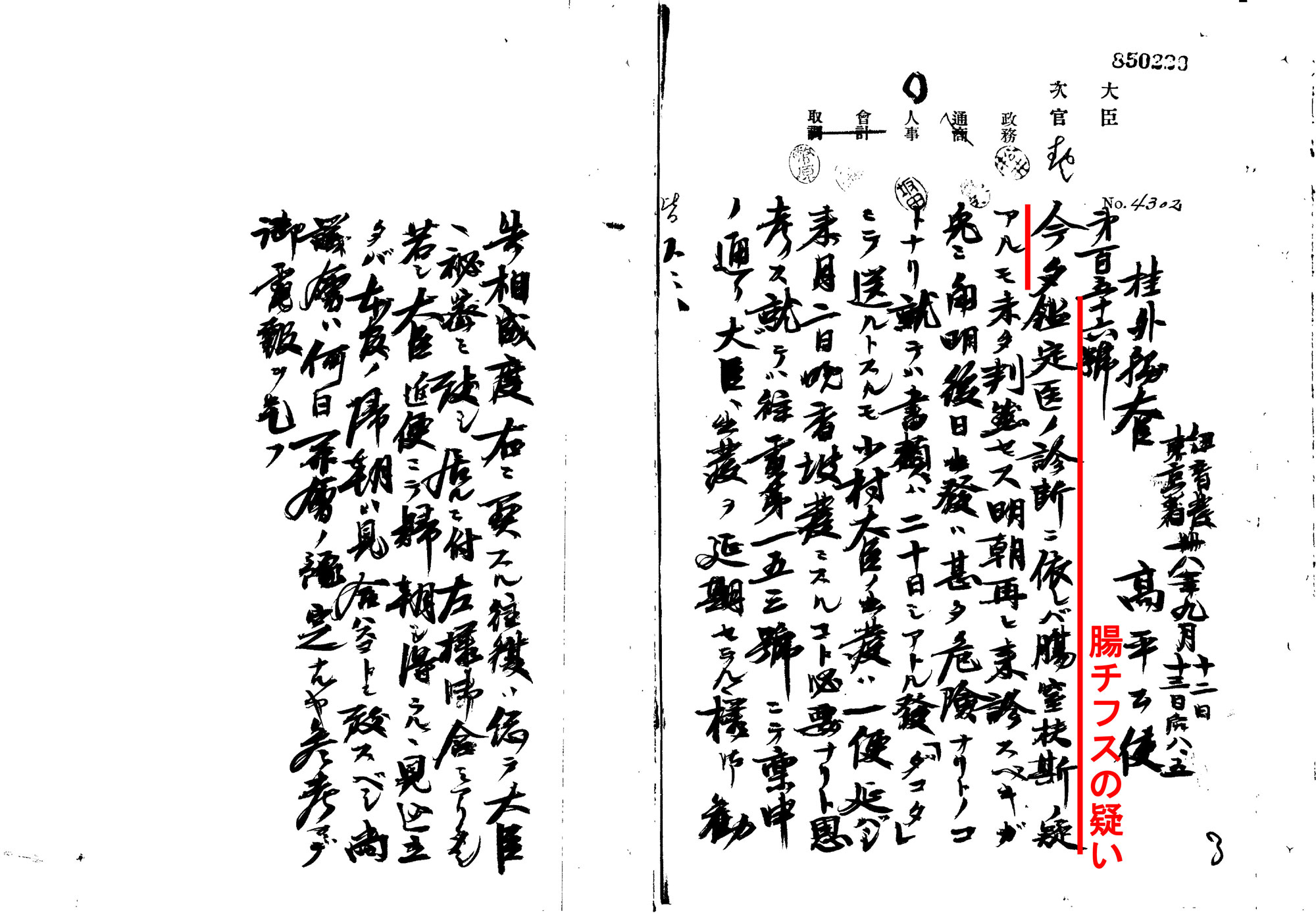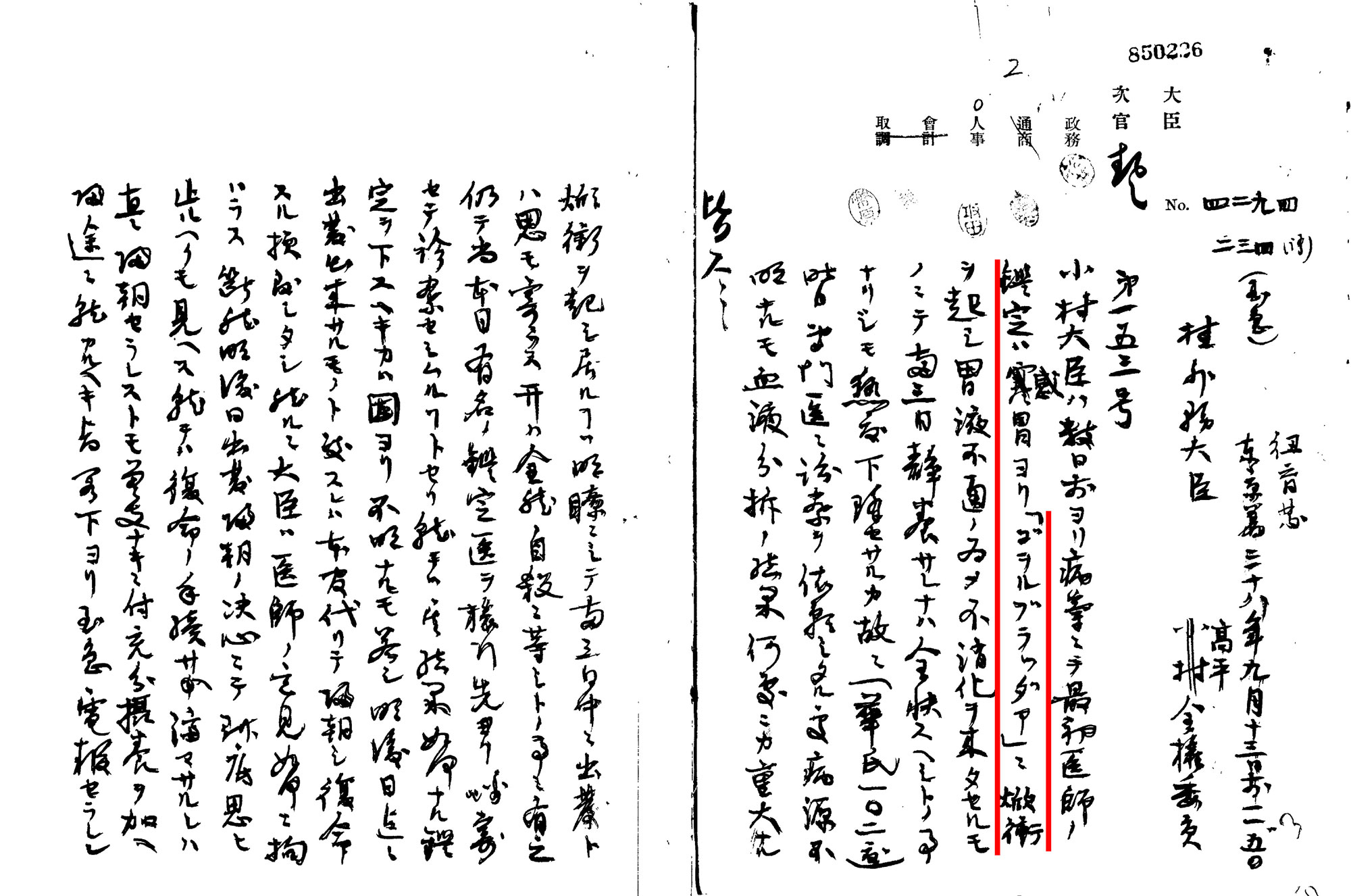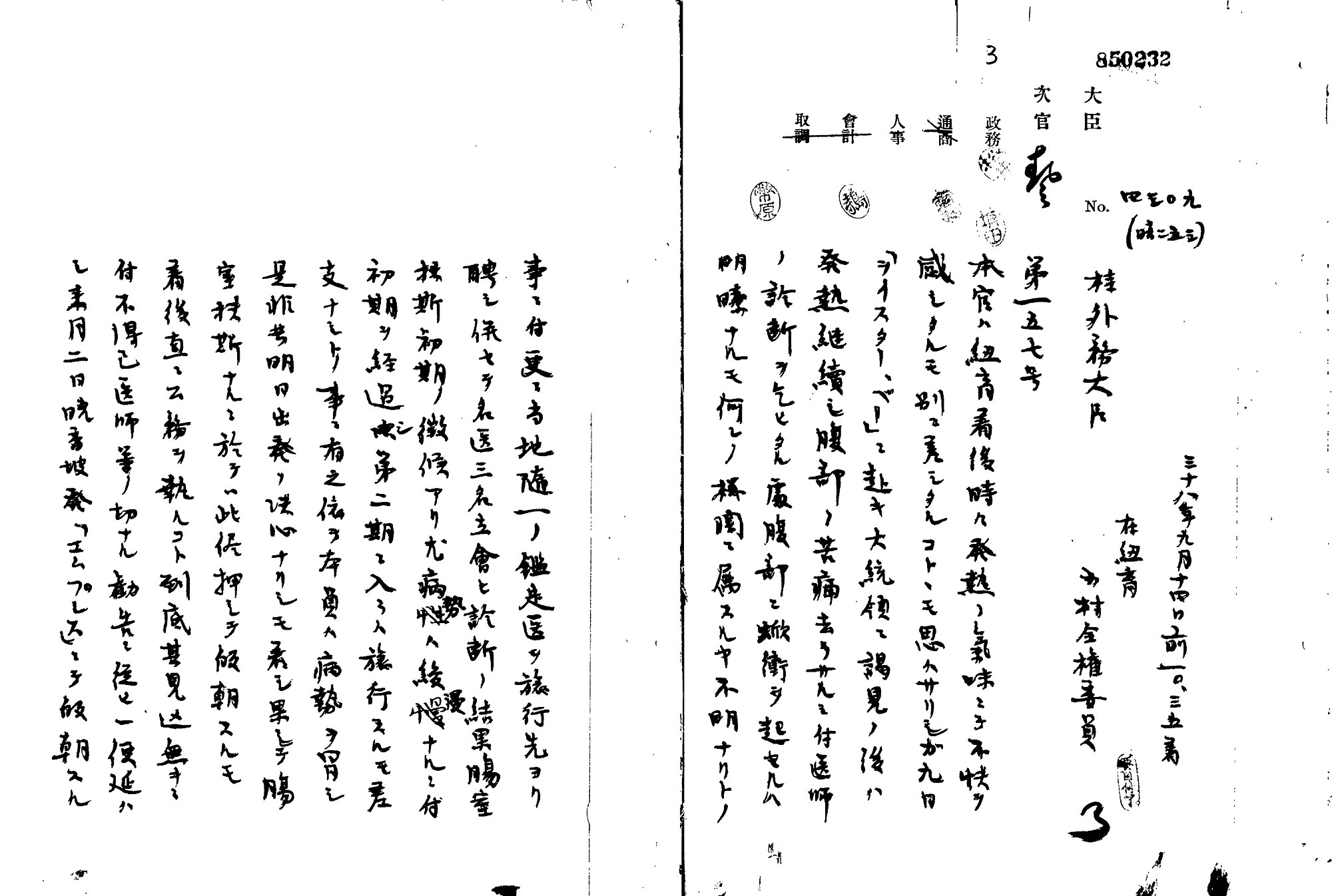 このような困難な交渉を日本側全権代表として担ってきた小村寿太郎は、苦労がたたったためか、講和条約締結の直後に発熱、腹痛を訴えました。 (6) は、9月10日に小村からアメリカのグラント将軍に対して出された電報です。この中で小村は、「昨夜から病気です」と述べ、翌日に予定されていたと思われる昼食会の辞退を申し出ています。 (7) は、9月13日午前に滞在地のニューヨークから本国に出された報告です。「ゴヲルブラッダア」(胆嚢)が炎症を起こしたために胃液が出ず、消化不良を起こしているという病状が記されています。 (8) は同じ日の午後に届けられた報告ですが、ここでは、夕方になって医師の診察を受けたところ、腸チフスの疑いがあるという診断結果であったと書かれています。