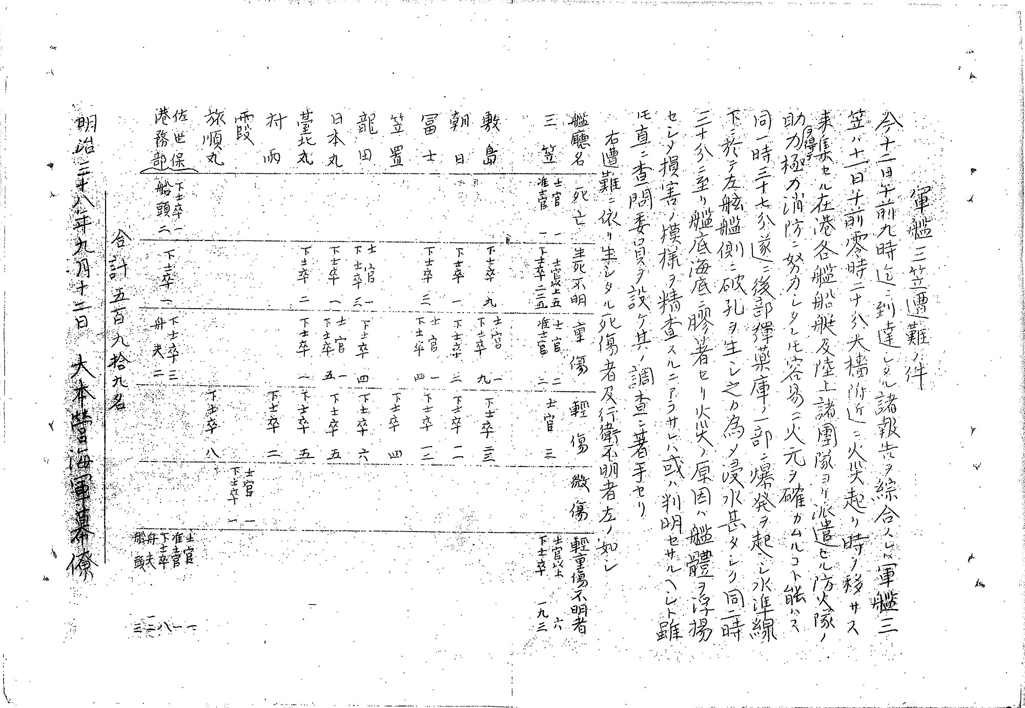 (4) は、事故の翌日の9月12日に、大本営海軍幕僚が事故の被害状況についてまとめた文書です。これによれば、9月11日午前0時20分に三笠で火災が発生、佐世保港の海上及び陸上から防火隊が集まって消火活動を行ったが火元がわからず、同午前1時37分に後部弾薬庫の一部が爆発して艦体の左側に穴があき、ここから激しい浸水が起こって2時30分には三笠は海底に沈んだ、というのが事故の概要です。火災の原因については、三笠の艦体を引き上げて調査を行わないとわからないだろうと記されています。また、左側の表を見ると、死傷者については、三笠だけでも、死亡が2名、生死不明が230名、重傷が4名、軽傷が3名、また、怪我の程度が不明となっているのが199名です。これに、敷島、朝日、冨士など、他の艦船の乗員や、佐世保港の要員を加えると、全死傷者数はこの時点で599名となっており、かなりの被害であったことがわかります。