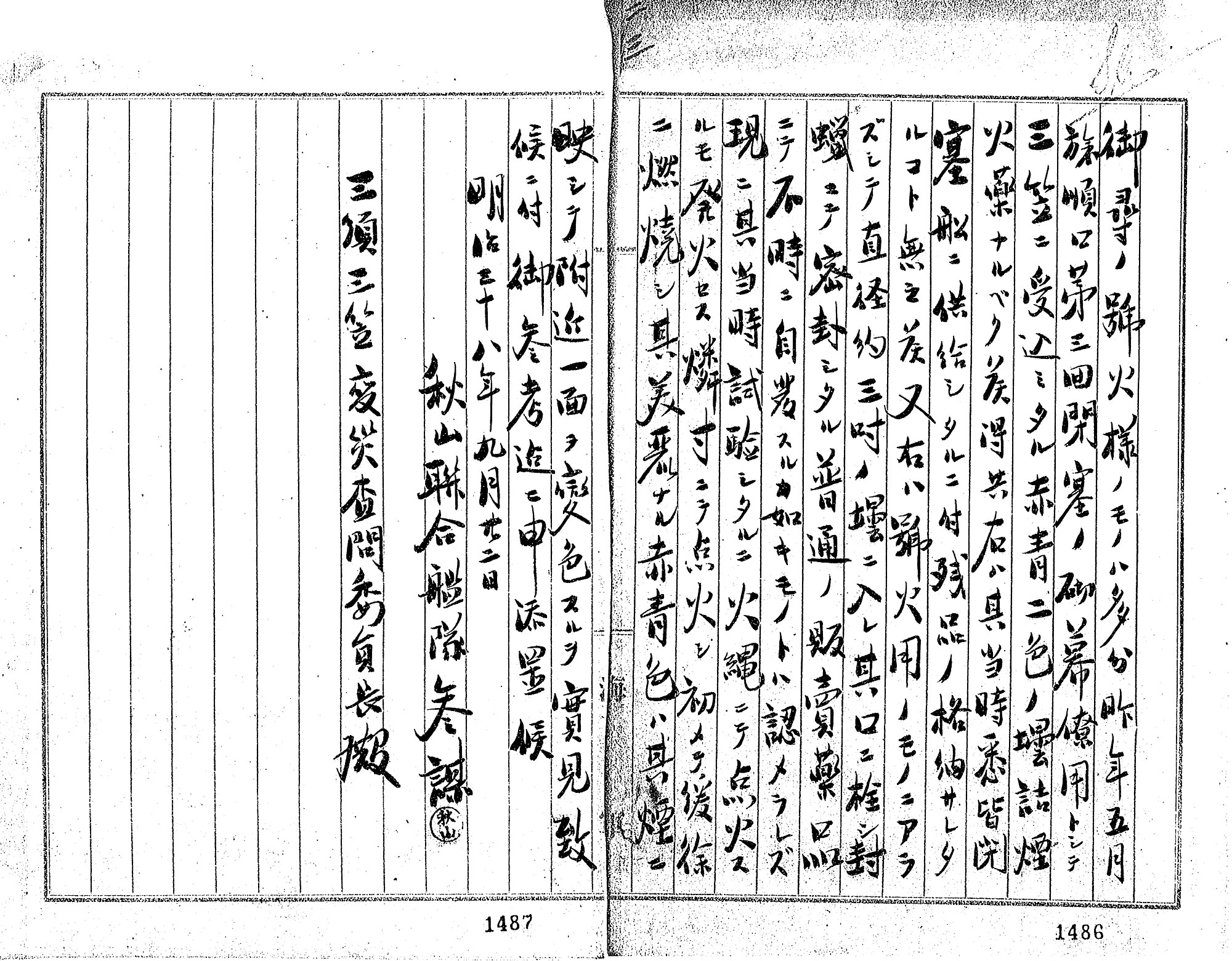 事故の直後、「三笠変災査問委員会」が組織され、事故の原因の調査に踏み出しました。この委員会は、関係者からの聞き込みを行って証言を集め、調査を進めていたようです。アジ歴では、委員会と関係者との間でやり取りされた文書を見ることができます。 (5) はその中の1つで、委員長の海軍中将三須宗太郎が、連合艦隊参謀の秋山真之(日露戦争での活躍が有名です)に事故原因に関する問い合わせを行った際に、秋山自らが返答を行った文書です(9月22日)。原因が「号火」(信号用の火)のために用意されていた火薬であると見られていたのか、三須委員長はこの火薬についての詳細を秋山に尋ね、これに対して秋山は、この火薬はそもそも密封した瓶詰めのもので簡単に火がつくことはない、という内容の返答を行っています。