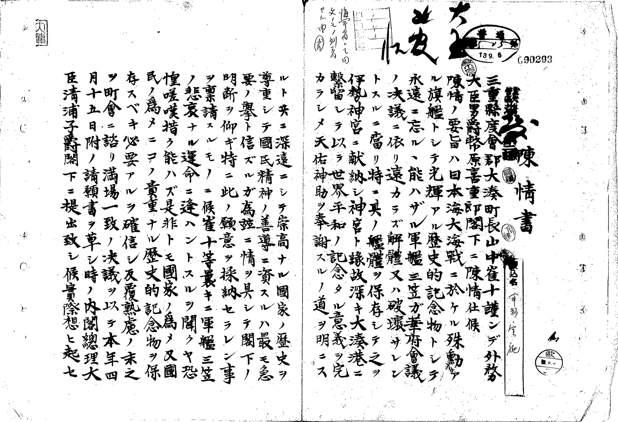 三笠は解体されることになっていましたが、この時、各地からその保存を求める声が起こりました。例えば (6) は、三重県度会郡大湊町長が外務大臣に出した陳情書の一部です。ここでは、日本海海戦で活躍した歴史的記念物として三笠は永遠に忘れることはできない、と述べられています。三笠保存運動は盛んなものとなり、「三笠保存会」が組織されました。 (7) は、保存会の会長が内閣総理大臣に出した請願書の一部で、各国政府と交渉して三笠を何らかのかたちで保存できるようにして欲しいと訴えられています。つまり、軍縮条約による制約を何とかしてかわし、三笠を解体せずに保存して欲しいという要望が、日本政府に寄せられていたわけです。
