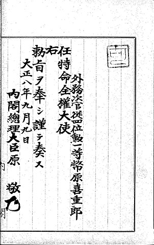 大正8年(1919年)、幣原は駐アメリカ特命全権大使に着任しました。 (2) はその任命の際の上奏文です。幣原大使は、1921年11月12日~1922年2月6日に開催されたワシントン会議に全権として関わりました。この会議で彼が特に力をいれて取り組んだのは、太平洋問題(「四国条約」)と中国問題であったと言われています。「四国条約」は、日本・アメリカ・イギリス・フランスの間で締結された条約です。主に、太平洋諸島に関して締約国間で紛争が生じ、通常の外交交渉での解決が見込めない場合には、共同会議を開催し解決にあたることなどを取り決め、太平洋の現状維持をはかろうとするものでした。