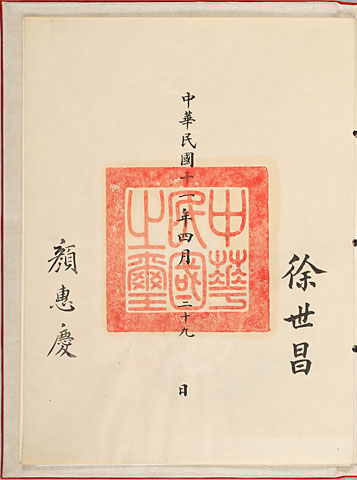 一方、中国問題とは、いわゆる「対華21ヶ条要求」に端を発する山東省の権益問題の解決に関わる交渉です。中国側の強硬姿勢もあり、交渉は困難を極めましたが、36回と言われる交渉を重ね、大正11年(1922年)2月4日、「山東懸案解決条約」が調印されました。 (4) はその中国側の批准書の一部です。