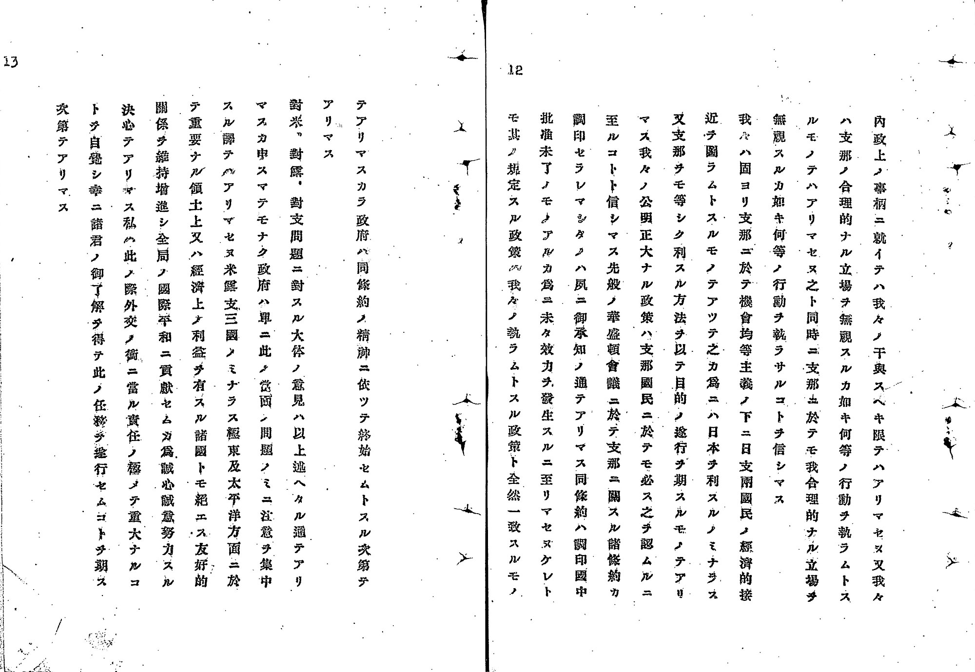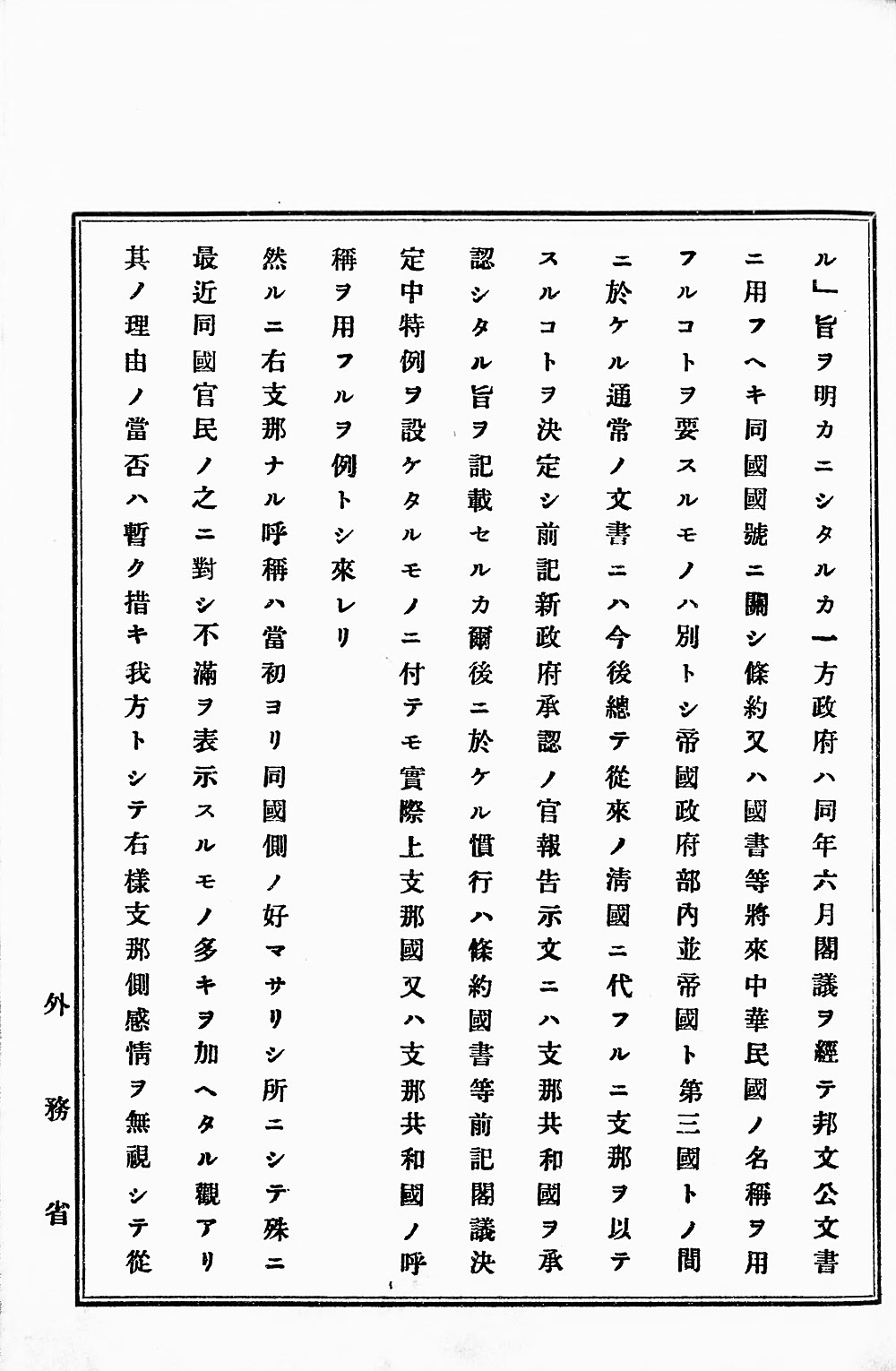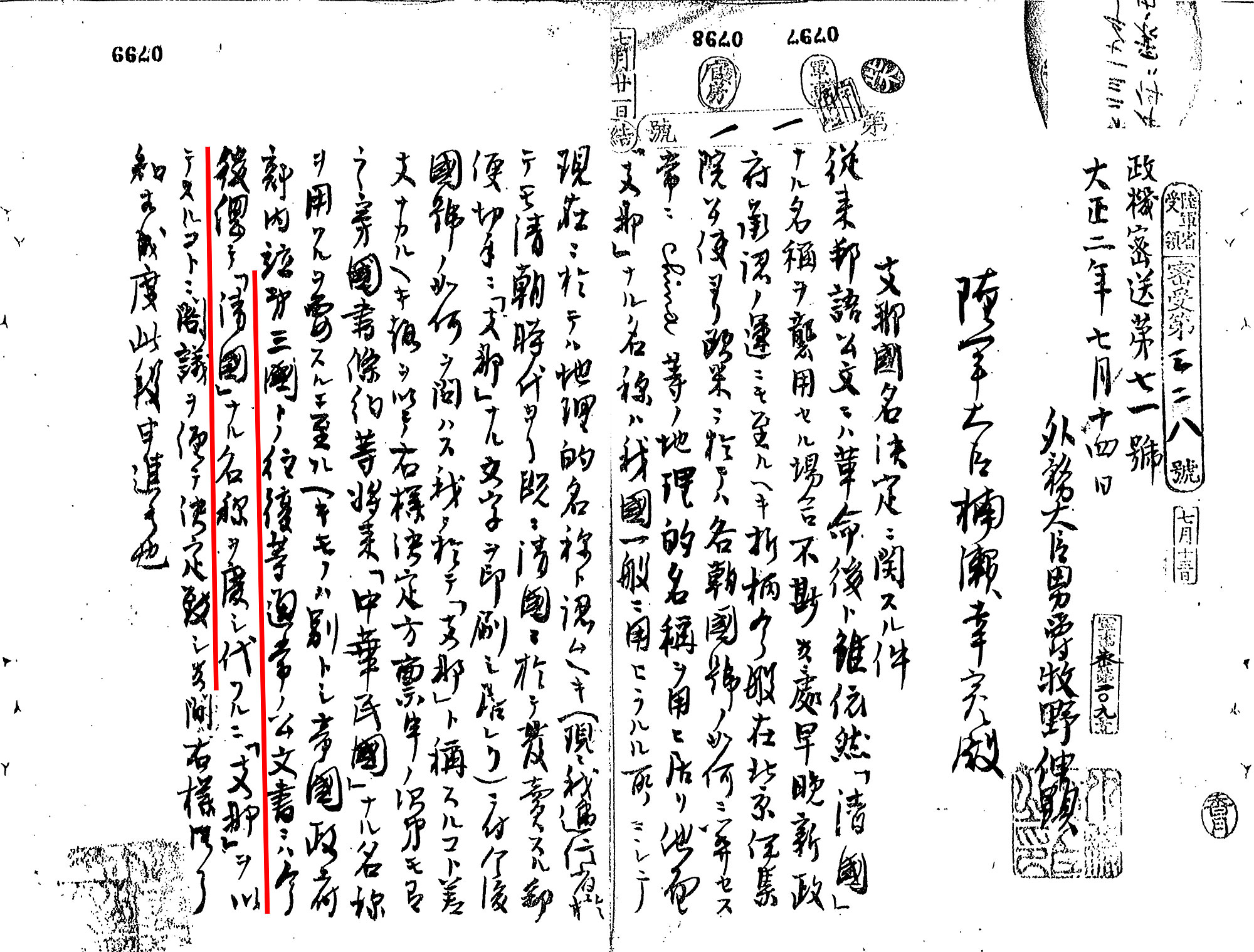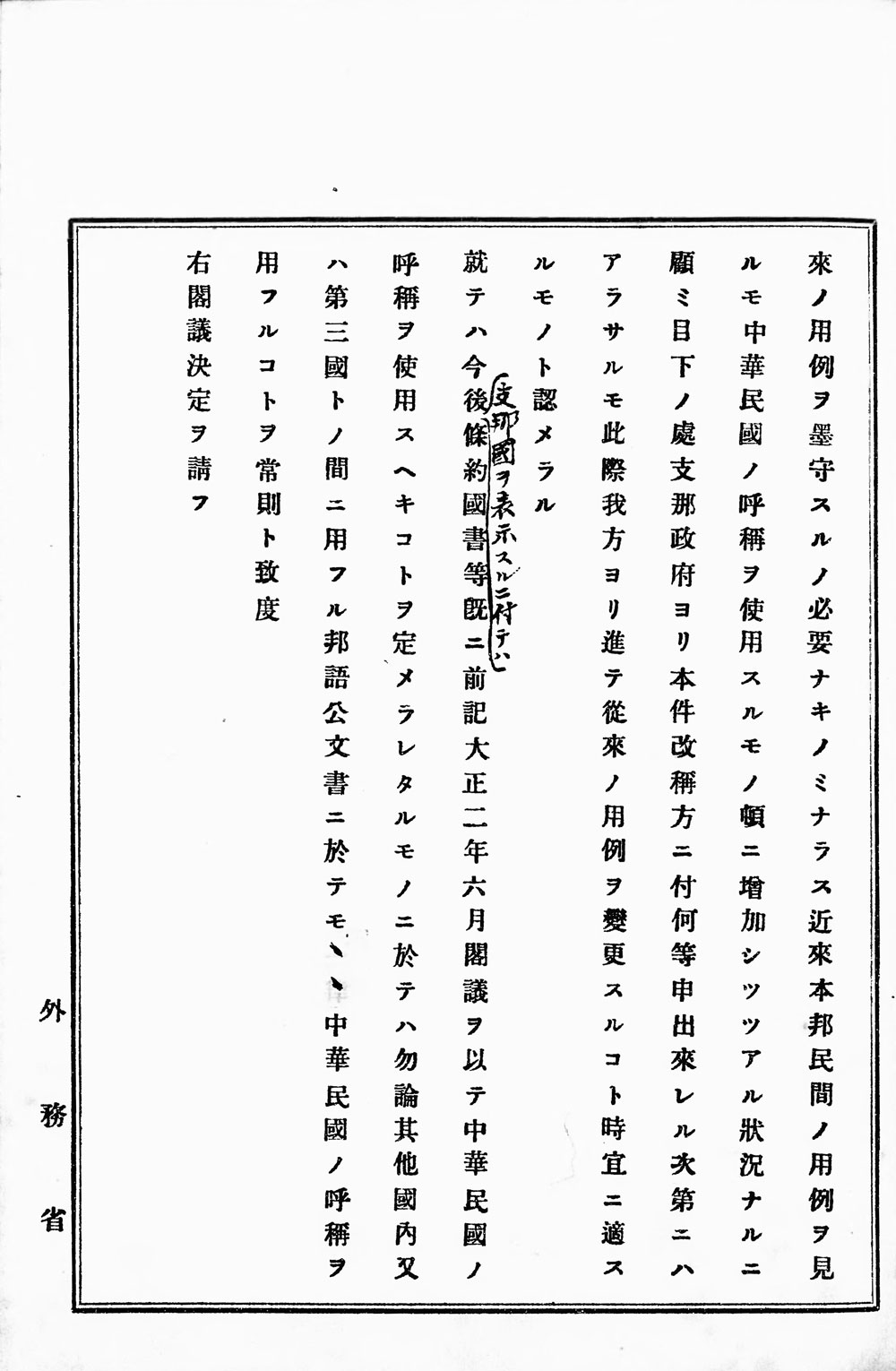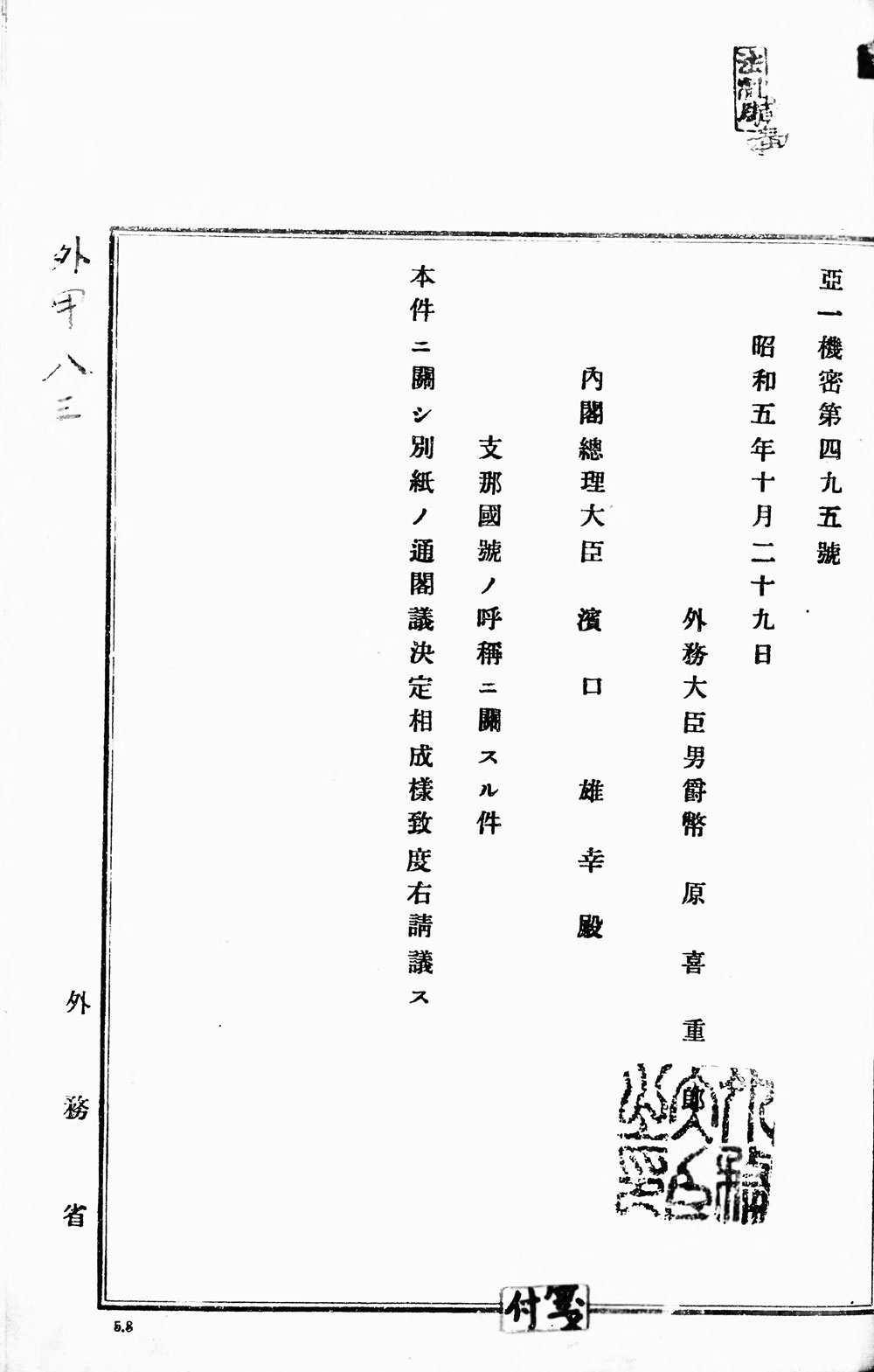 また、当時の日本は、大正2年(1913)6月の閣議決定に基づいて、中国を「支那」と呼称していました (9)。しかし中国側はこれを好まず「中華民国」の呼称を用いるよう求めていました。これに配慮する形で浜口内閣は、昭和5年(1930年)10月、原則として「中華民国」の呼称を使用することを閣議決定しました( (10)、 (11)、 (12)、 (13) )。