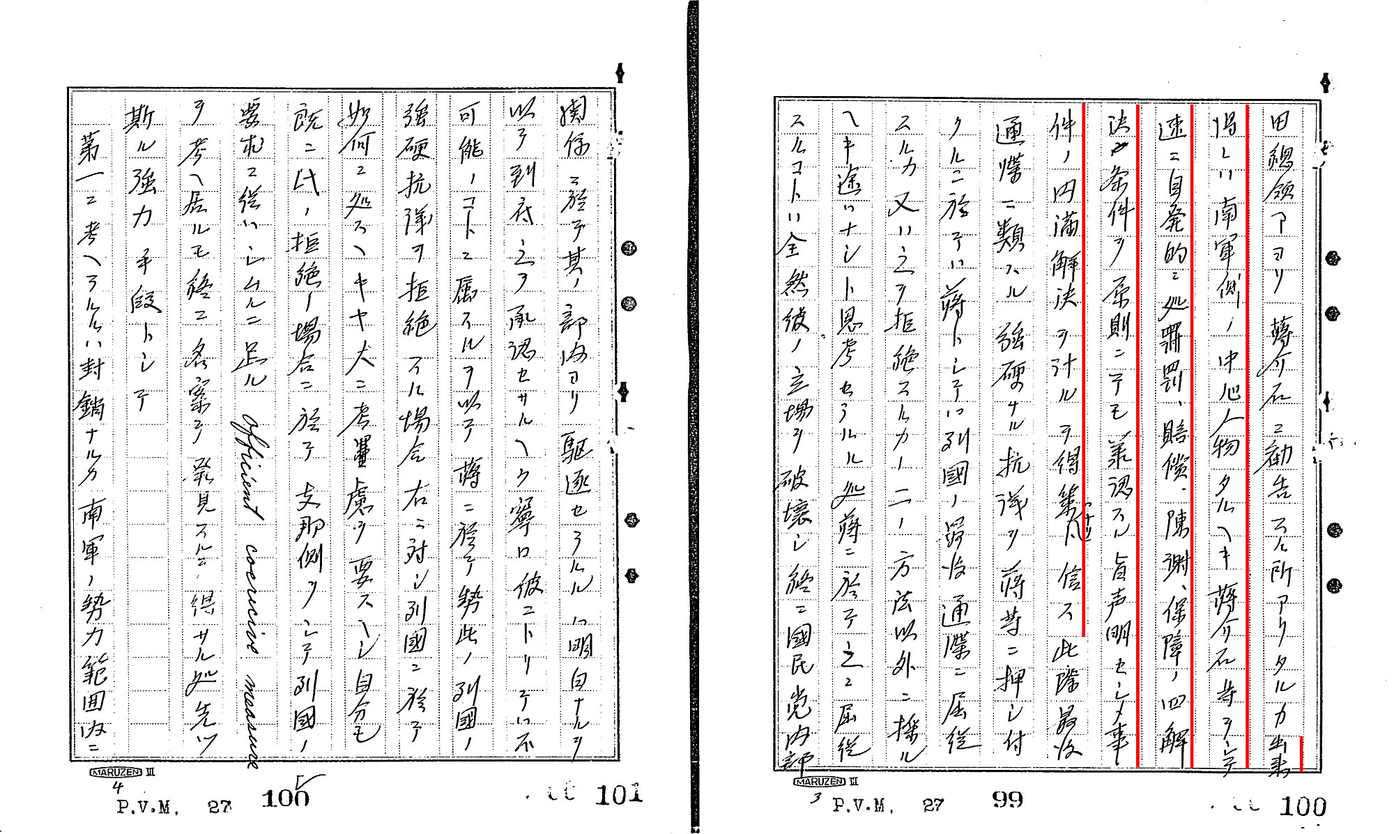 最初の懸案は中国の関税自主権承認問題でした。国民政府による北伐の完了後、アメリカ、イギリス、フランスなどの各国がこれを承認していたため、日中間の交渉のみが残されていました。幣原は、重光葵在上海総領事に臨時代理公使を兼任させ、この交渉にあたらせました。その結果、昭和5年(1930年)5月6日、条件付きで中国の関税自主権を認める「日華関税協定」が重光臨時代理公使と王正廷外交部長との間で調印されました。(8) はその条約書の一部です。