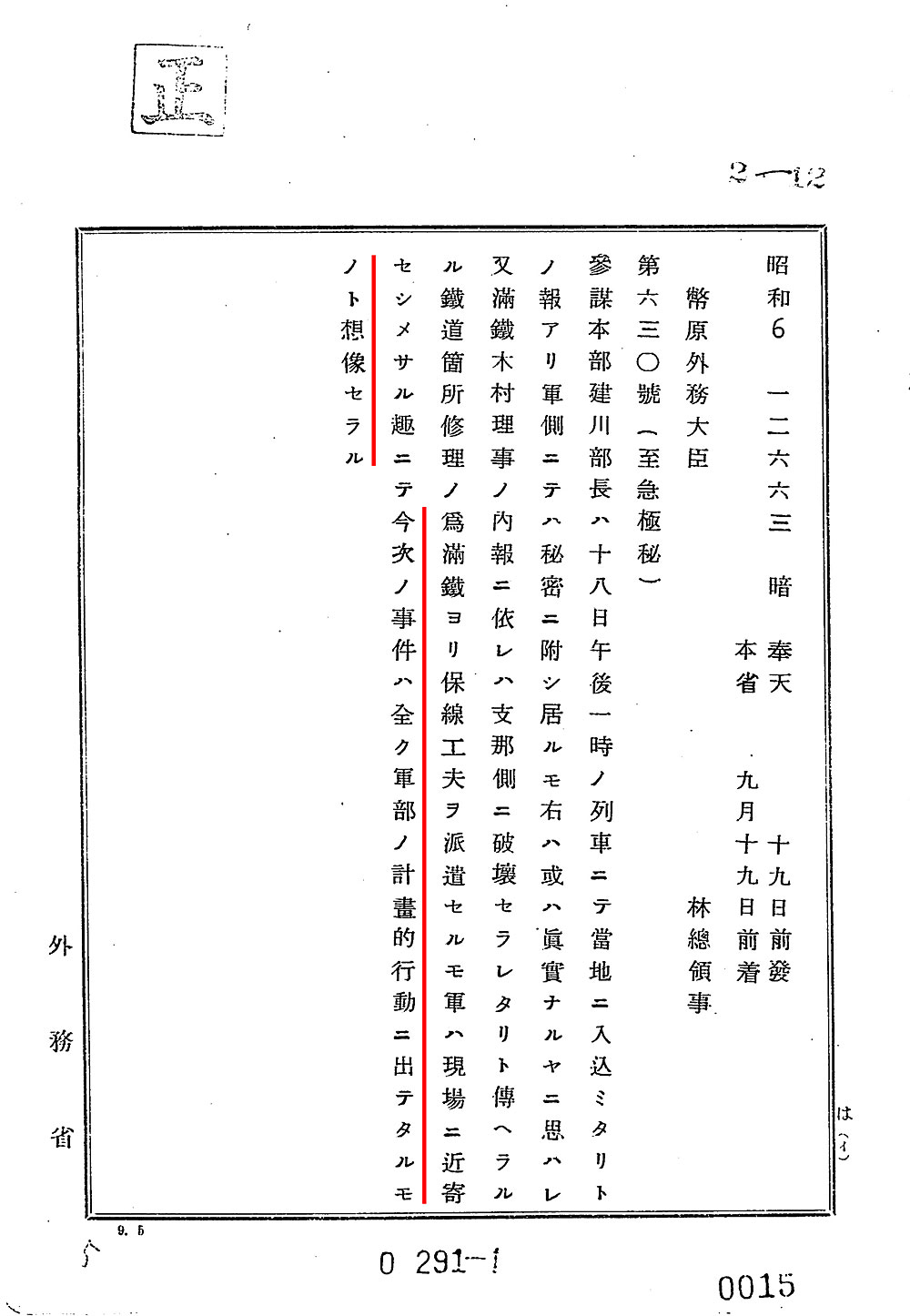 こうした状況下で、昭和6年(1931年)9月18日に満州事変が勃発しました。「今次の事変は全く軍部の計画的行動に出でたるものと想像せらる」という在奉天(現在の瀋陽)林総領事の電報((14))に接していた幣原は、閣議において事態の不拡大を軍部に求め、中国との直接交渉で解決を図ろうとしました。しかし、現地関東軍の独断行動によって事態は拡大し、中国側も直接交渉を避け国際連盟での討議を追求するなど、幣原の方針は窮地に追い込まれました。そんな中、満州事変の混乱などが原因となって若槻内閣は総辞職し、幣原も外相の座を降りました。 (15) はこの時の幣原の辞表です。