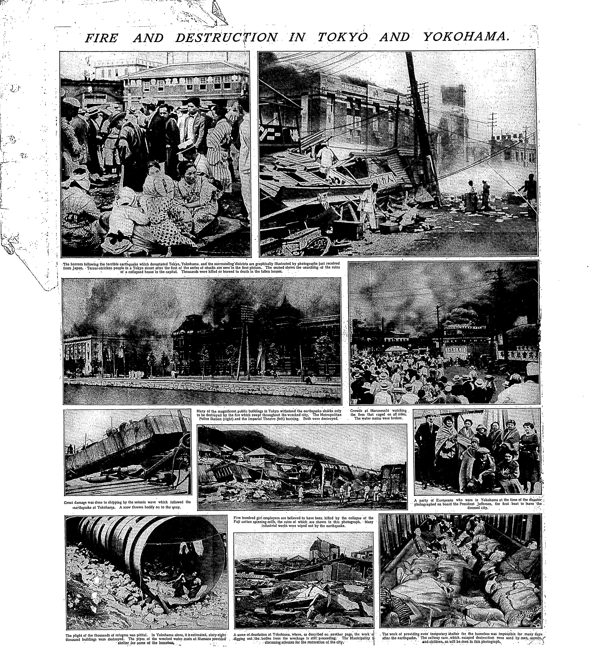 この大火災は9月3日の午前まで続き、市域の面積の約44パーセントが焼失したともいわれています。なお、当時の東京は、今日の東京都全体に相当する地域が「東京府」(とうきょうふ)、23区に相当する地域が「東京市」(とうきょうし:全部で35区でした)とされていました。また、人々は東京をよく「帝都」(ていと:大日本帝国の首都という意味)と呼びました。関東大震災は、この帝都の半分近くを焼け野原にしてしまったのです。