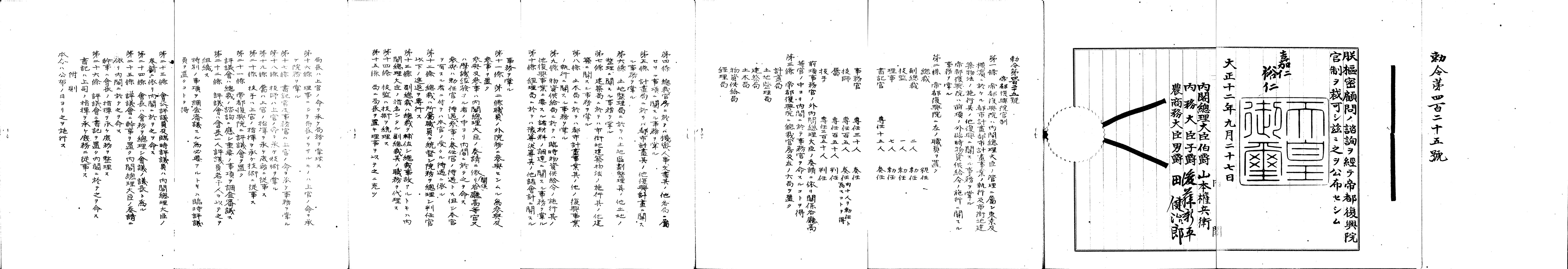 その一方で、政府内では復興に向けた準備がいち早く開始されていました。震災発生の翌日に発足した山本権兵衛内閣では、この日のうちに、復興事業を担う特別な機関である「帝都復興院」の設立が提案されています。その後の議論を経て、帝都復興院は、内閣総理大臣直属の機関として9月27日に実際に設立されることとなり(4)、各所から優れた技術者が集められ、その総裁には、数か月前まで東京市長であった内務大臣の後藤新平が就任しました(5)。